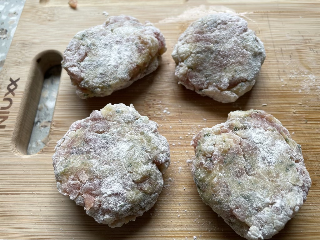 Former des galettes d’environ 5 cm de diamètre, les aplatir légèrement et les rouler dans la farine.