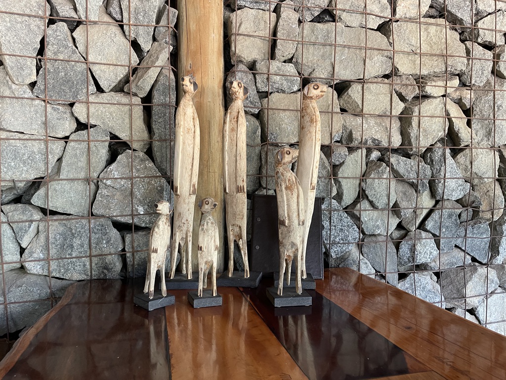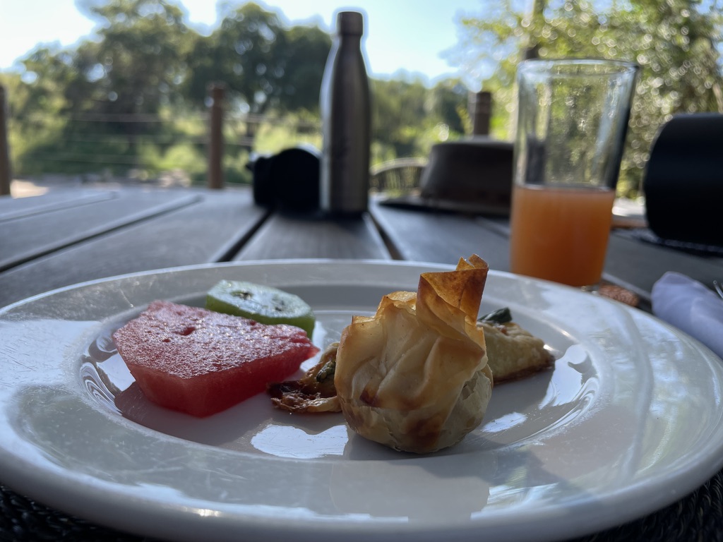 Chaque tente dispose d’une belle salle de bain (même si la baignoire est pleine d’insectes le soir 🙂 et d’une douche extérieure sans lumière – pour ne pas attirer les bestioles j’imagine. A disposition, tout ce qu’il faut pour se faire un thé ou un café, des petits gâteaux, de l’eau fraiche. Et une station de chargement performante entre 5h du matin et 10h le soir.