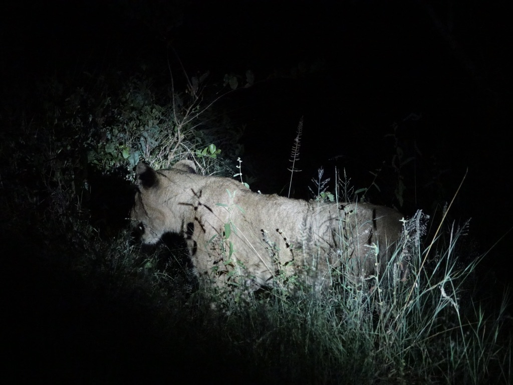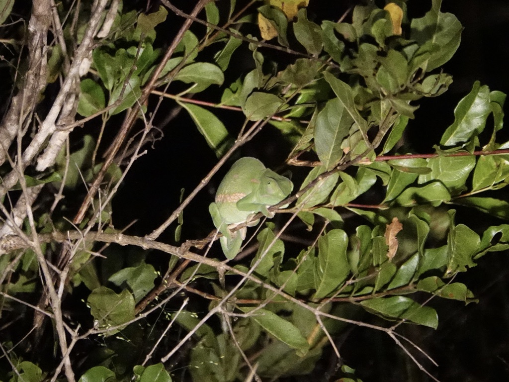 Après le coucher de soleil, le retour au lodge se fait en safari de nuit, avec quelques belles opportunités. Ne me demandez pas comment les guides arrivent à voir des caméléons à la lueur du projecteur, dans un véhicule en mouvement !!