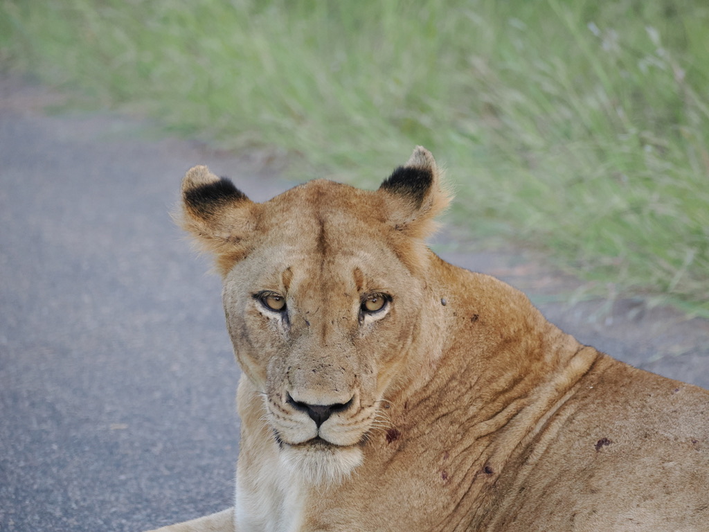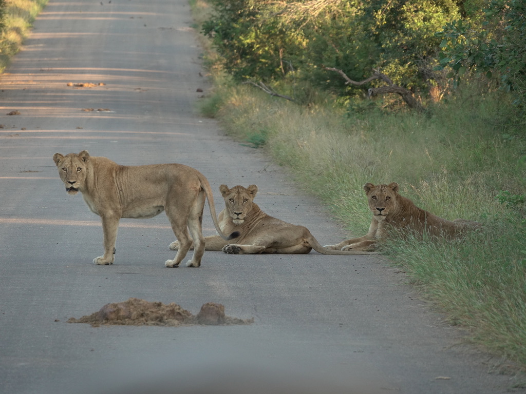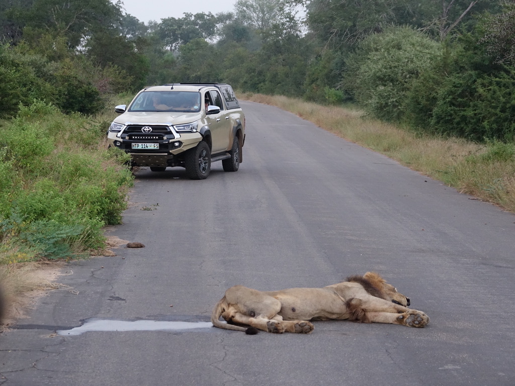 Notre guide James est en relation avec les autres guides du lodge et communique également avec d’autres confrères, ce qui permet de savoir quand il se passe quelque chose sur route ! Les lions adorent se reposer sur le bitume chaud. Nous avons vu les 3 lionnes et les 2 lions sur la même route à des moments différents.