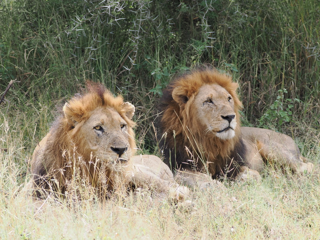 Les deux mâles sont des frères, qui tiennent le teritoire autour du Rhino Post. Nous les verrons à plusieurs reprises, dont cette journée où nous les avons trouvés au même endroit matin, après-midi et soir. Ce n’est pas très étonnant puisque les lions chassent la nuit et se reposent pendant la journée.