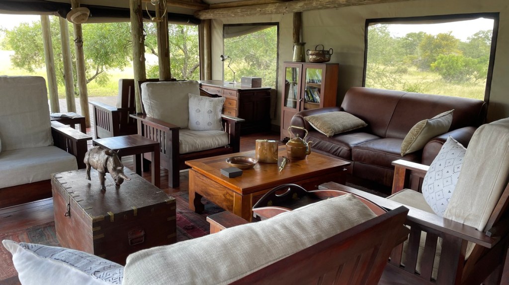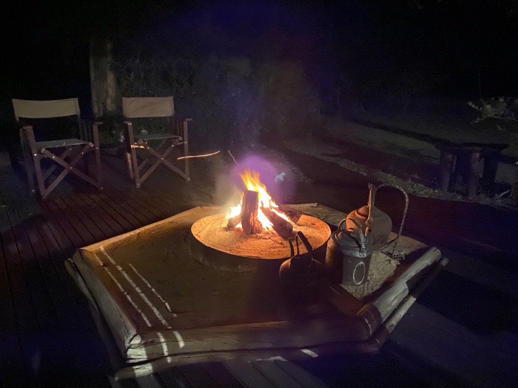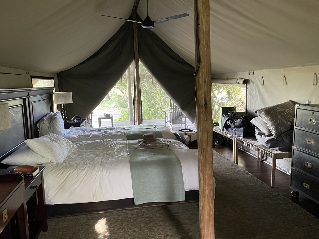 Parlons rapidement du bush camp, composé de 4 tentes avec salle de bains privative, installées à l’ombre d’un massif de Knobthorn et rafraîchies par des ventilateurs de plafond.