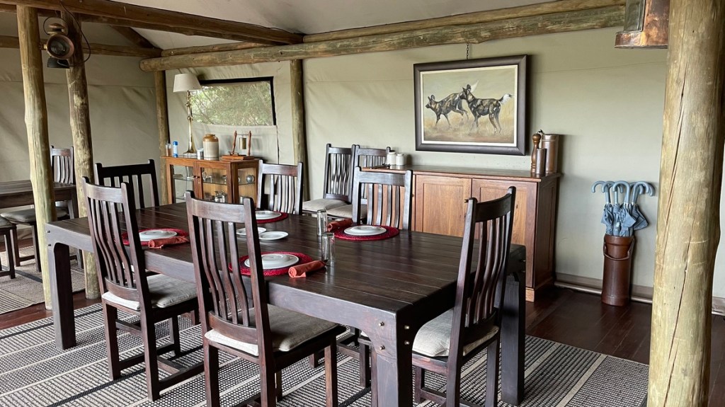 La salle à manger et le salon (très confortable) sont ouverts sur la plaine. La décoration se compose d’objets anciens, conservés par les propriétaires du lodge.