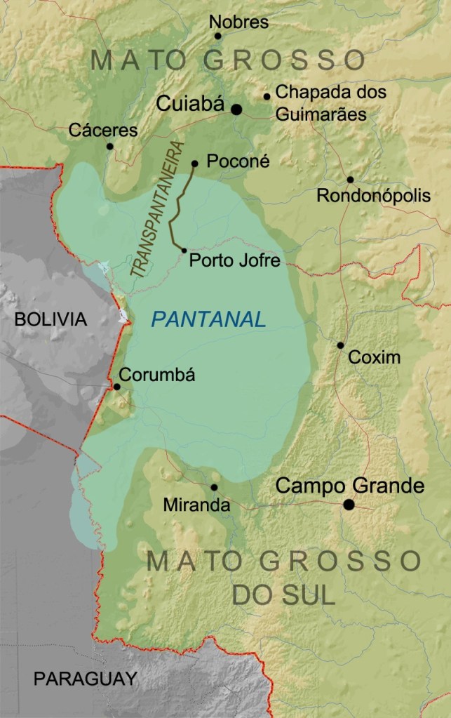 Les plaines alluviales du Pantanal s’étendent sur les états brésiliens du Mato Grosso et Mato Grosso do Sul, ainsi que dans les pays voisins du Paraguay et de la Bolivie. Sa superficie varie entre 140 000 et 210 000 km2, selon la saison (comparable à la superficie de la Grèce). À son apogée, le Pantanal représente 3 % de la superficie mondiale des zones humides d’eau douce.