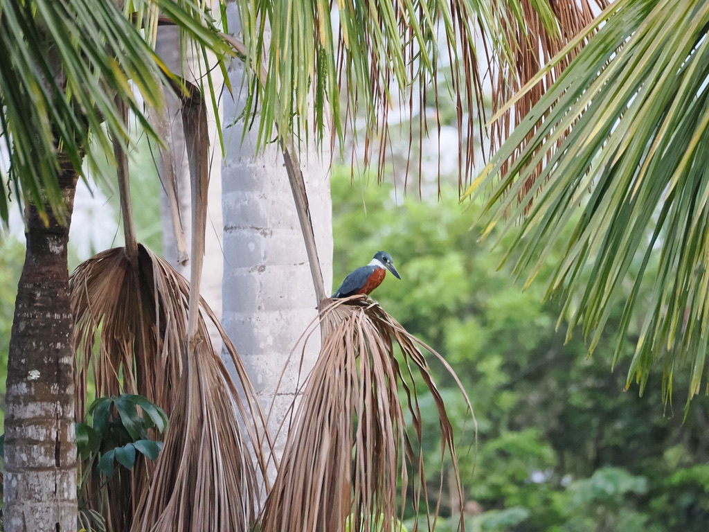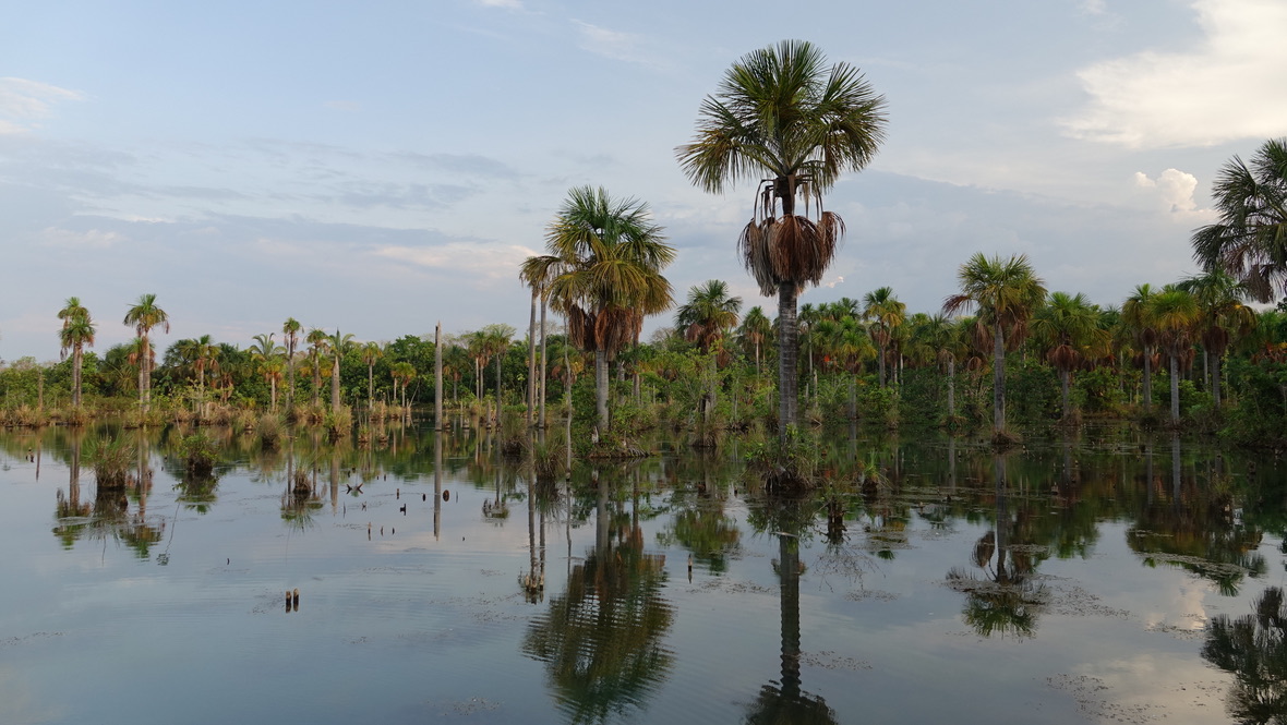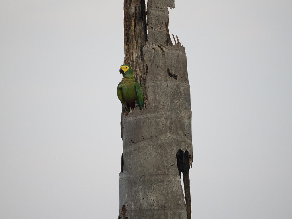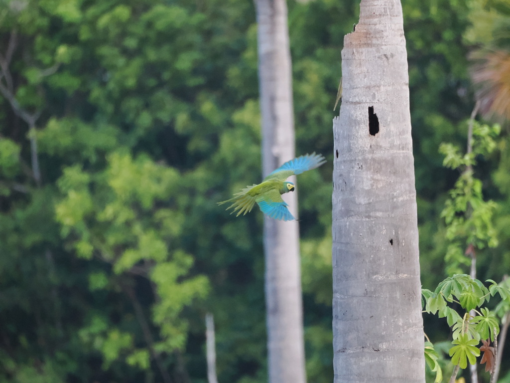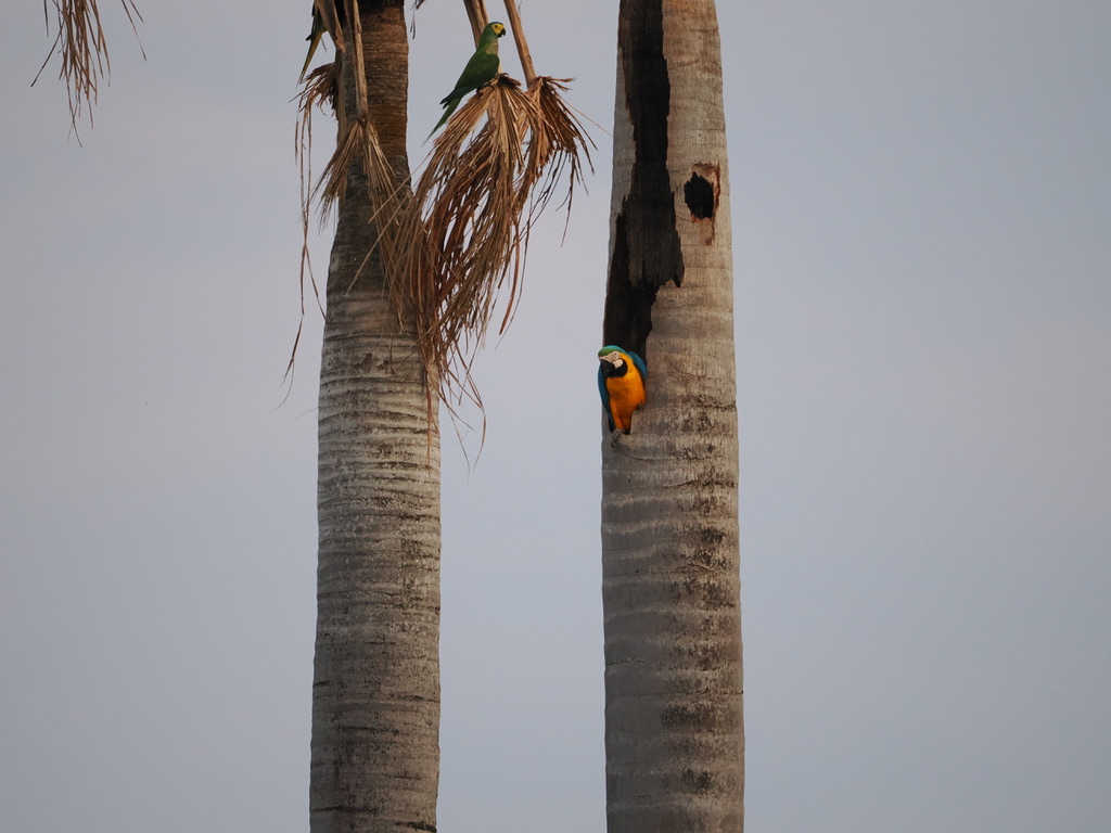 Juana nous explique que leur présence est un gage de qualité de l’eau. Lorsqu’il meurt, le Buriti perd sa couronne et sa tige devient creuse, ce qui constitue un habitat favorable pour que les aras, les maritacas et d’autres oiseaux installent leurs nids. Deux plateformes d’observation ont été aménagées.