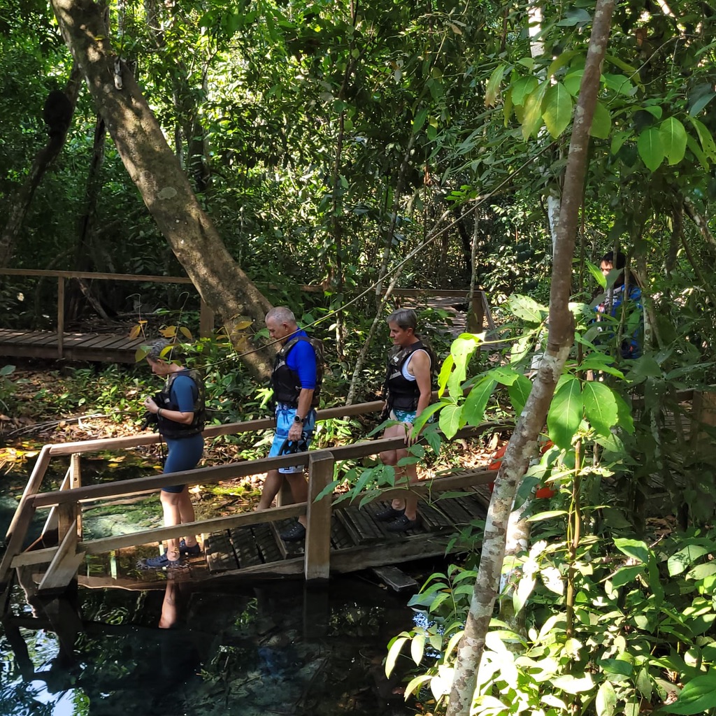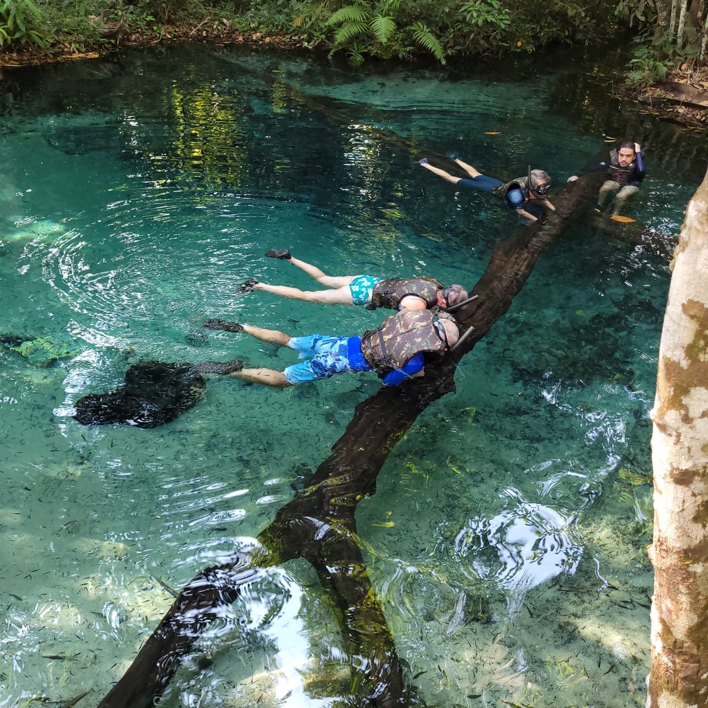 L’activité comprend 20 minutes de « flottaison » dans ce bassin de 6 mètres de profondeur à son maximum, où surgissent 3 sources. Il y a une multitude de tout petits poissons, qui viennent picorer les visiteurs ! On poursuit avec un snorkeling tranquille dans la rivière au gré d’un léger courant, les poissons sont de bonne taille, notamment les dourados. Les bruits de la forêt contrastent avec l’activité paisible.