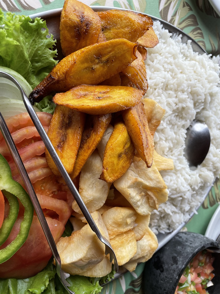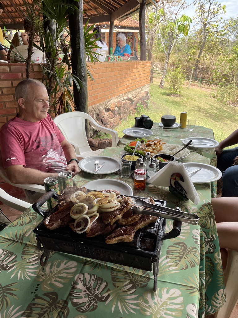 Après un dernier effort pour rejoindre le point de départ, un excellent déjeuner de grillades nous attend au Restaurante Véu de Noiva. Nous sommes accordés pour de la viande de boeuf. Elle est servi sur un brasero avec de nombreux accompagnements savoureux – riz, manioc frit, banane plantain, farofa, tomates et oignons en salade.