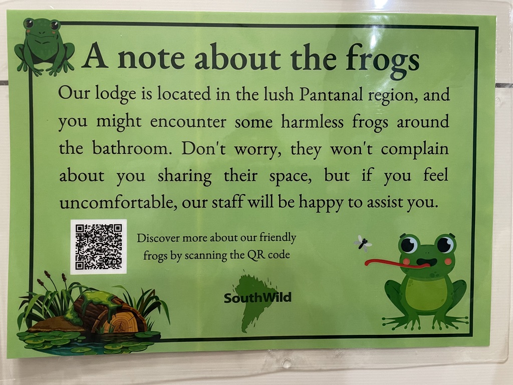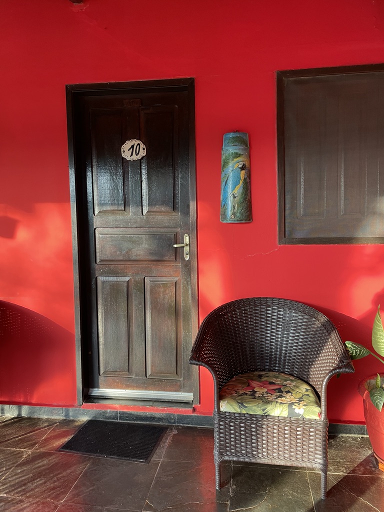 Les 15 chambres spacieuses sont climatisées, disposent également d’un ventilateur, d’un hamac et de fauteuils confortables sous la véranda. La décoration est sympathique. Il y a de la place pour les valises et un bureau pour le matériel photo. L’affiche dans la salle d’eau m’a beaucoup amusée 🙂