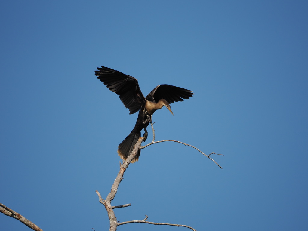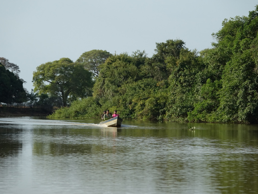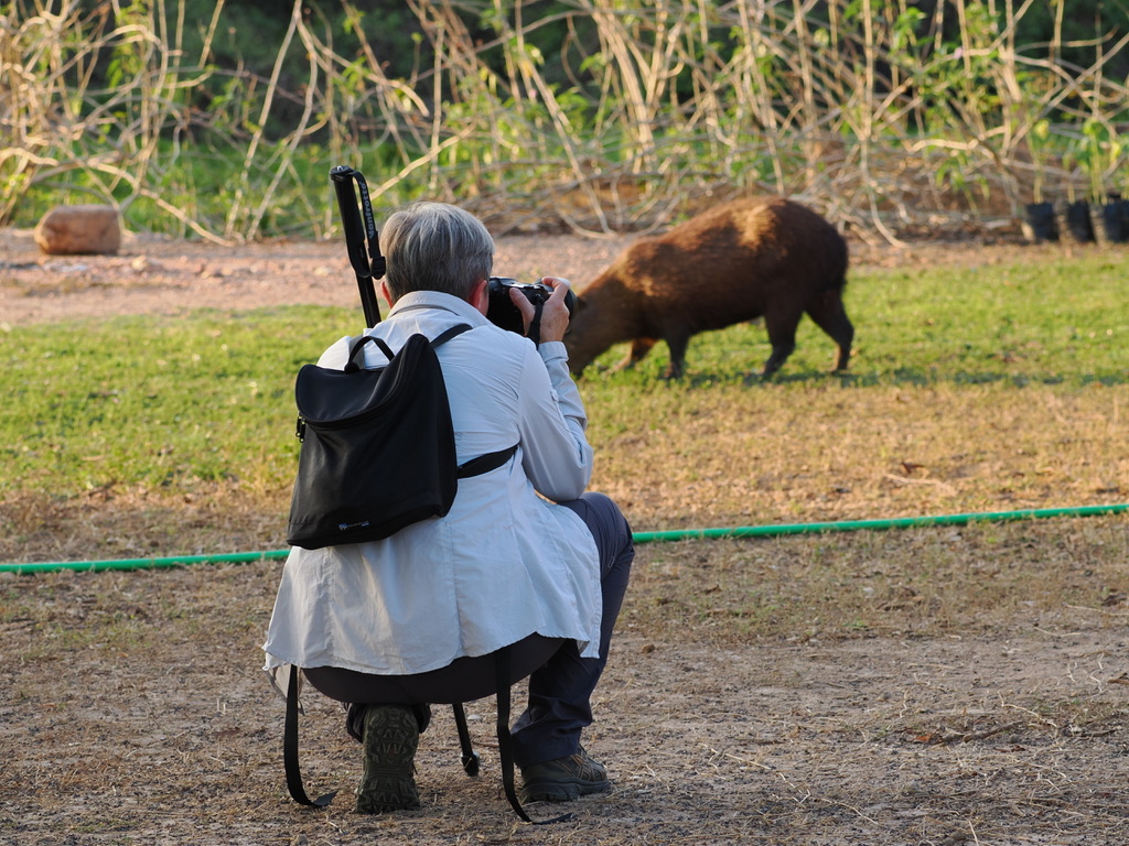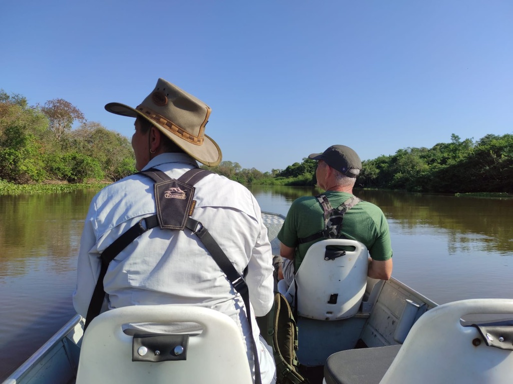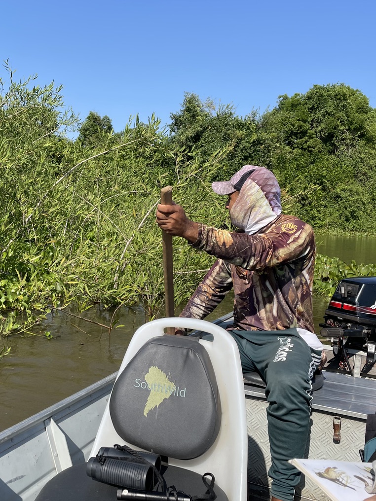 L’activité phare est la sortie en bateau sur la rivière Pixaim, avec 2 départs par jour, le matin de 8h à 10h et l’après-midi de 15h à 17h. L’activité est privative, on s’arrête donc quand on le souhaite et on passe le temps nécessaire avec nos sujets photographiques. Chapeau et bouteille d’eau obligatoires, le soleil tape dur. Voyez comme le pilote se protège.
