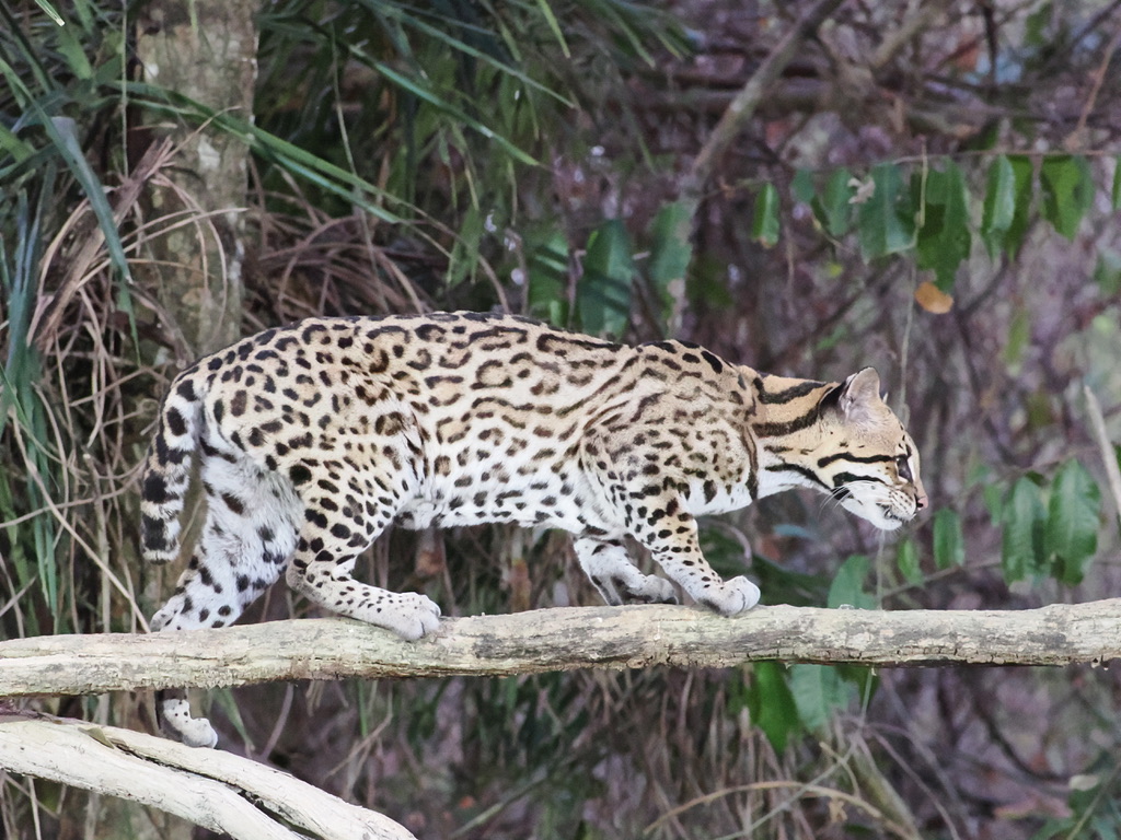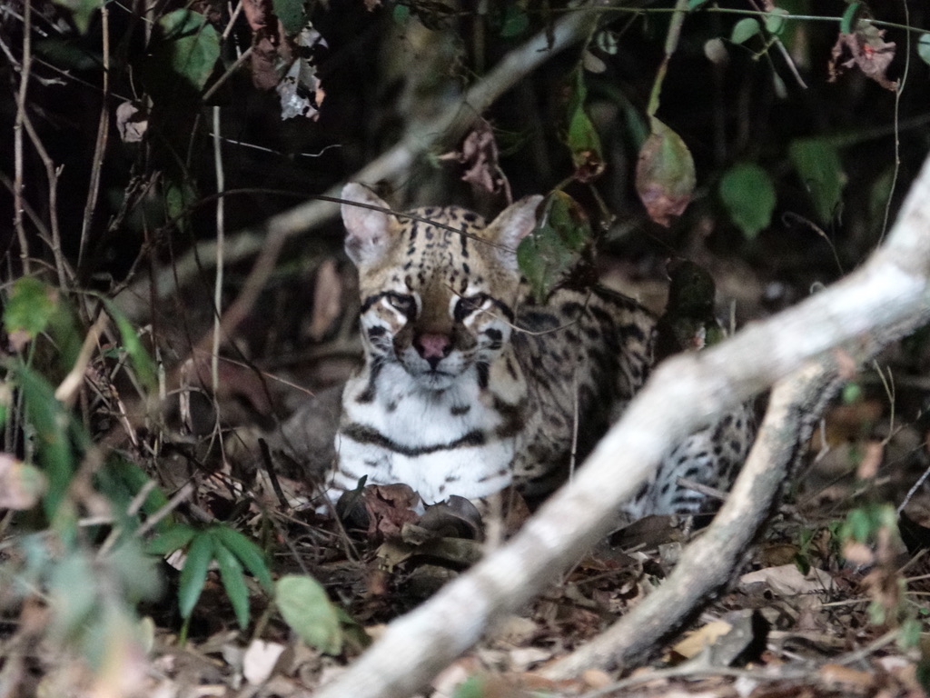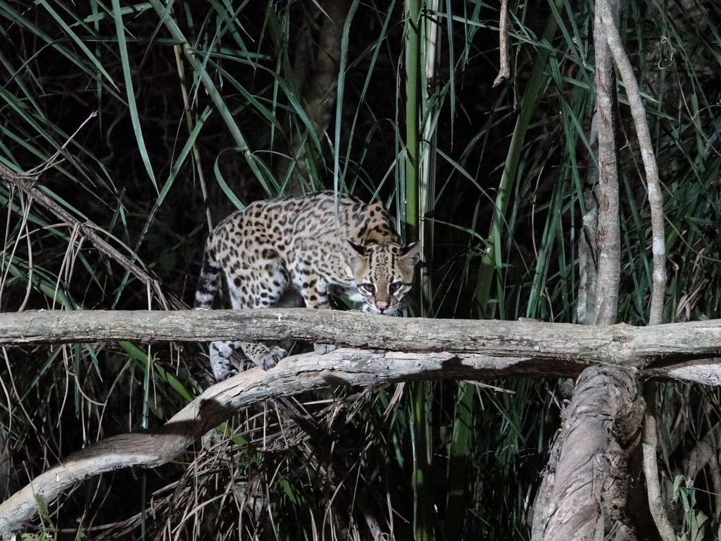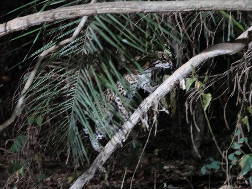 On est à une dizaine de mètres du petit félin (de la taille d’un cocker). Cette femelle vient se nourrir de poisson depuis une dizaine d’années. Nous avions 2 soirées pour l’apercevoir, la seconde fut la bonne ! Bien sûr, l’activité est organisée avec un animal habitué mais l’ocelot est un animal discret, si difficile à voir en safari ou en randonnée que personne ne fait la fine bouche.