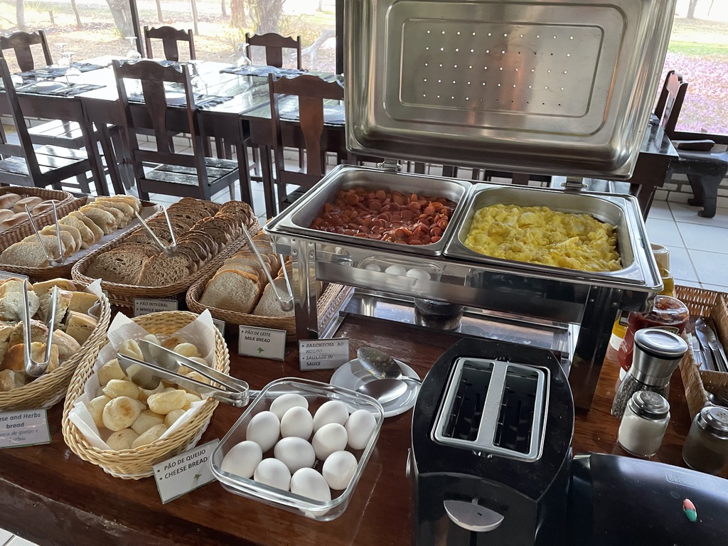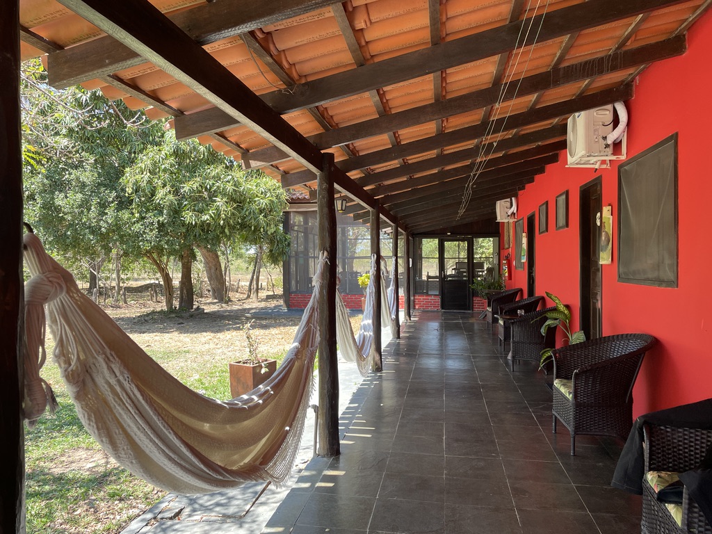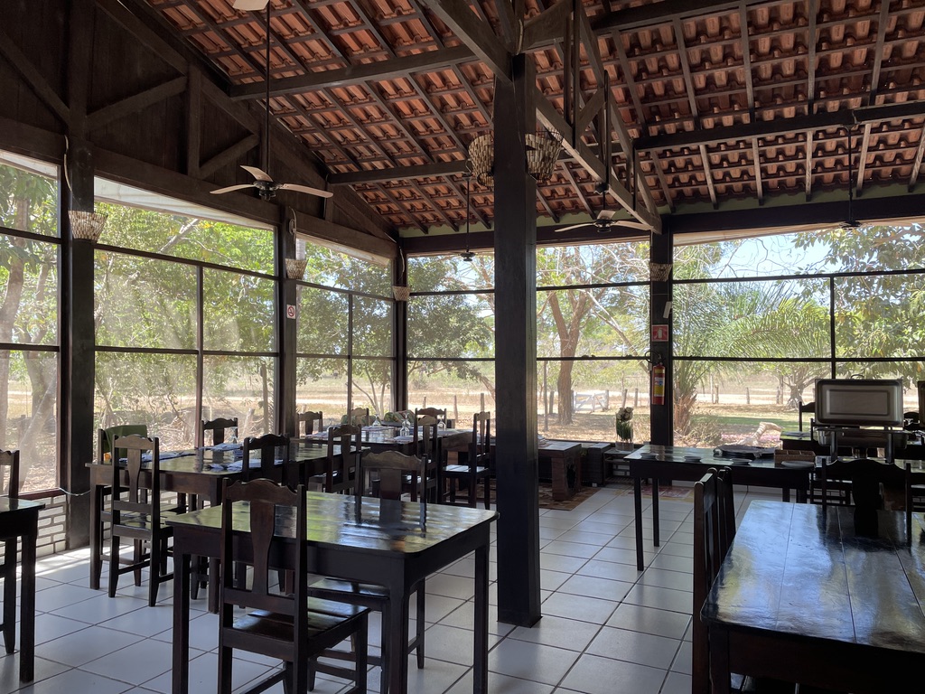 Le lodge se compose d’un grand salon – salle à manger ouvert. Des moustiquaires nous protègent des insectes. De nombreux ventilateurs assurent le confort des hôtes. Les buffets sont variés, proposant des recettes locales et des produits de la ferme. Le petit déjeuner est international et brésilien.