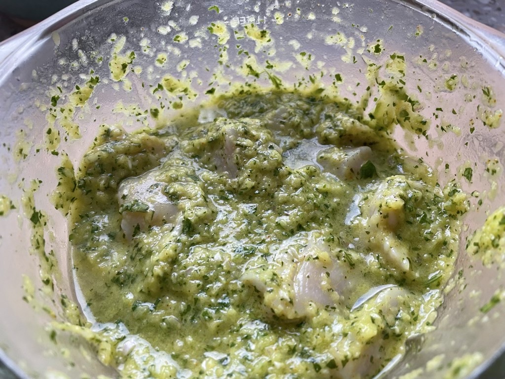 Préparer une marinade en mixant l’huile d’olive, l’oignon, l’ail, le curcuma, le vinaigre, le persil, le sel et le poivre.