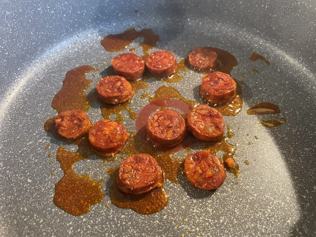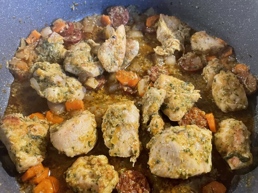 Faire dorer le poulet dans l’huile de la saucisse puis réserver.