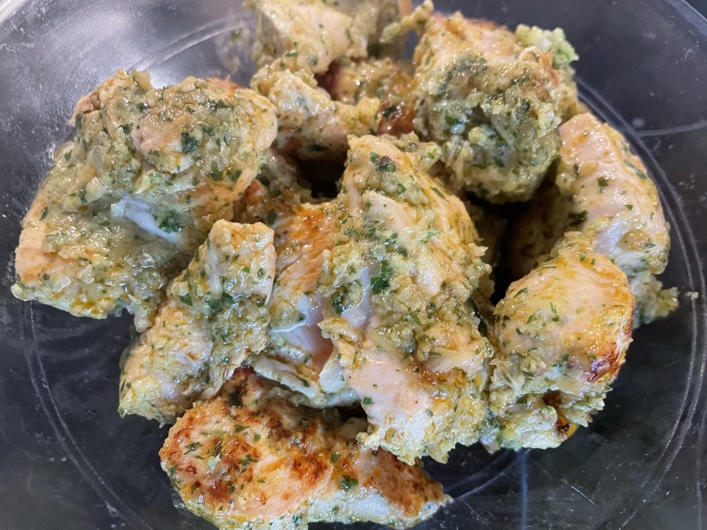 Mélanger les dés de poulet avec la marinade. Mettre au frigo pendant au moins 2 heures.
