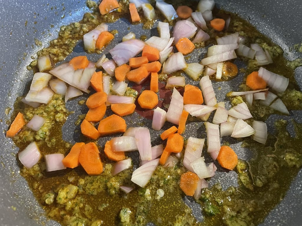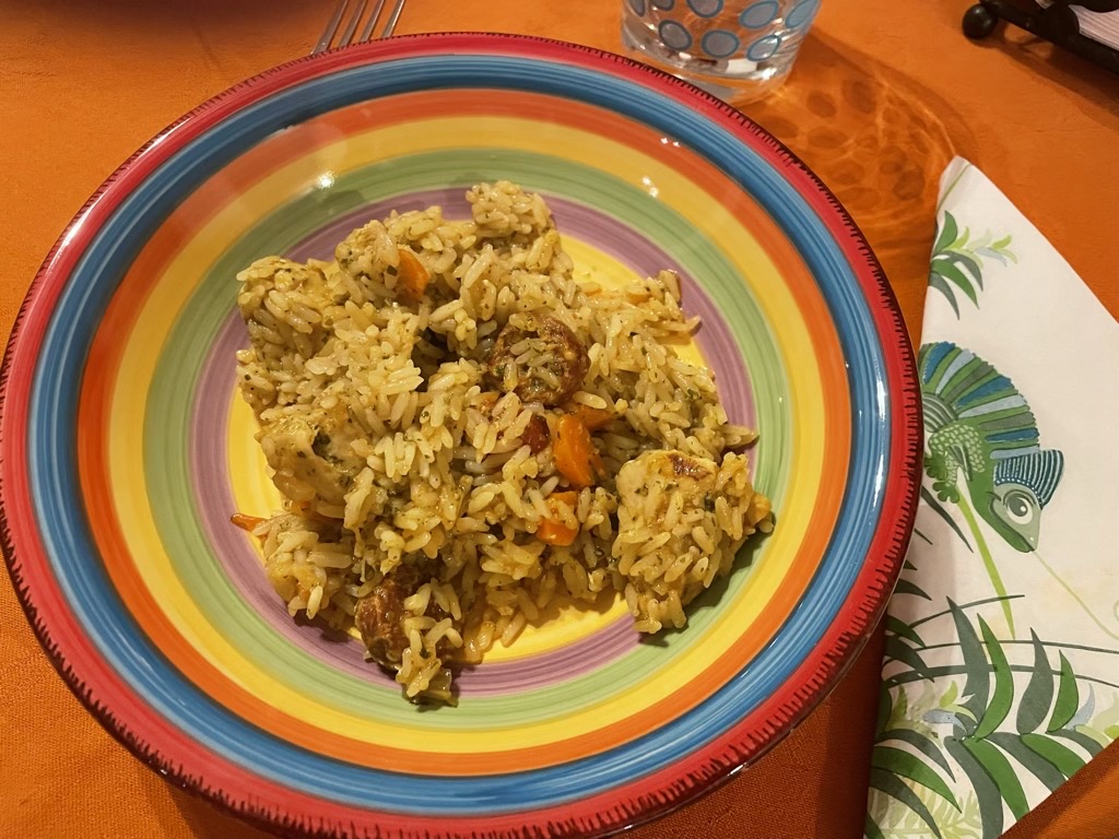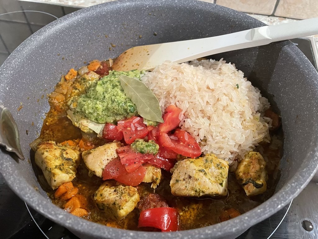 Laisser mijoter jusqu’à ce que le riz soit cuit (environ 15 à 20’ comme pour un risotto ou une paella).