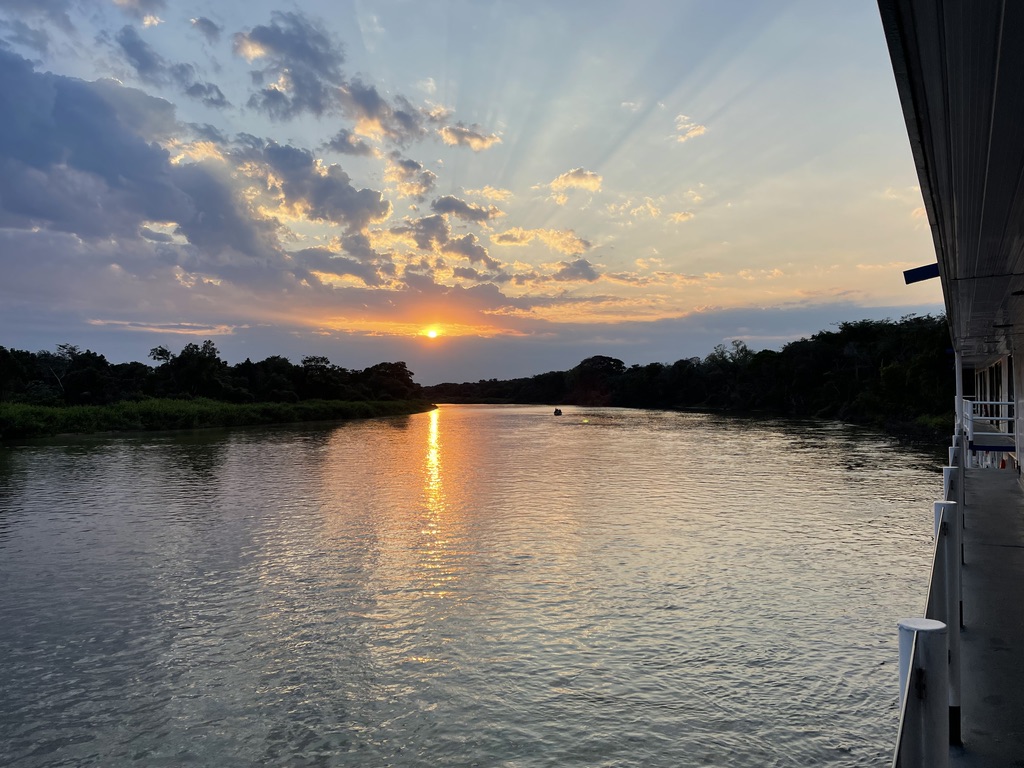 C’est l’heure de rentrer avec le coucher de soleil sur la rivière.