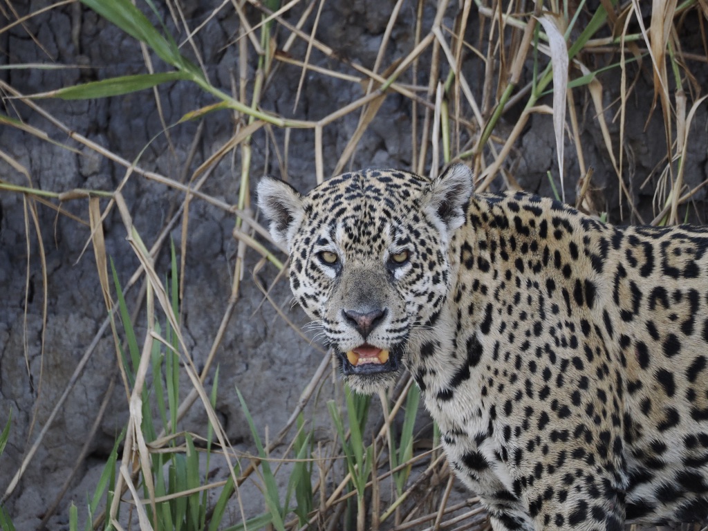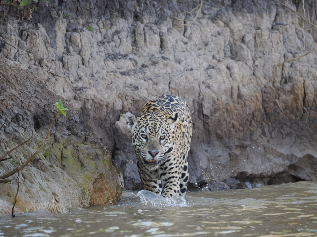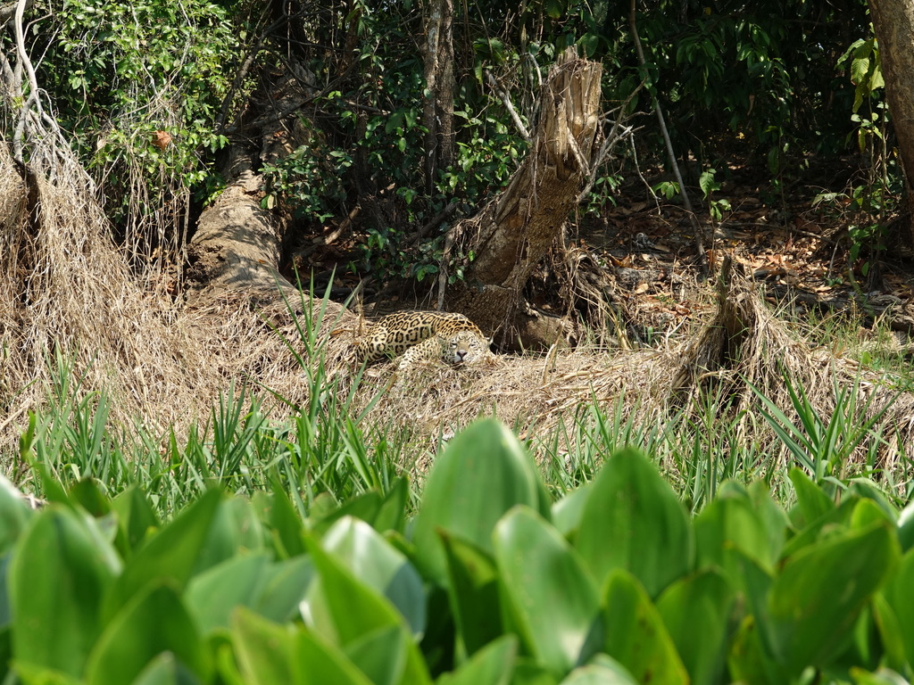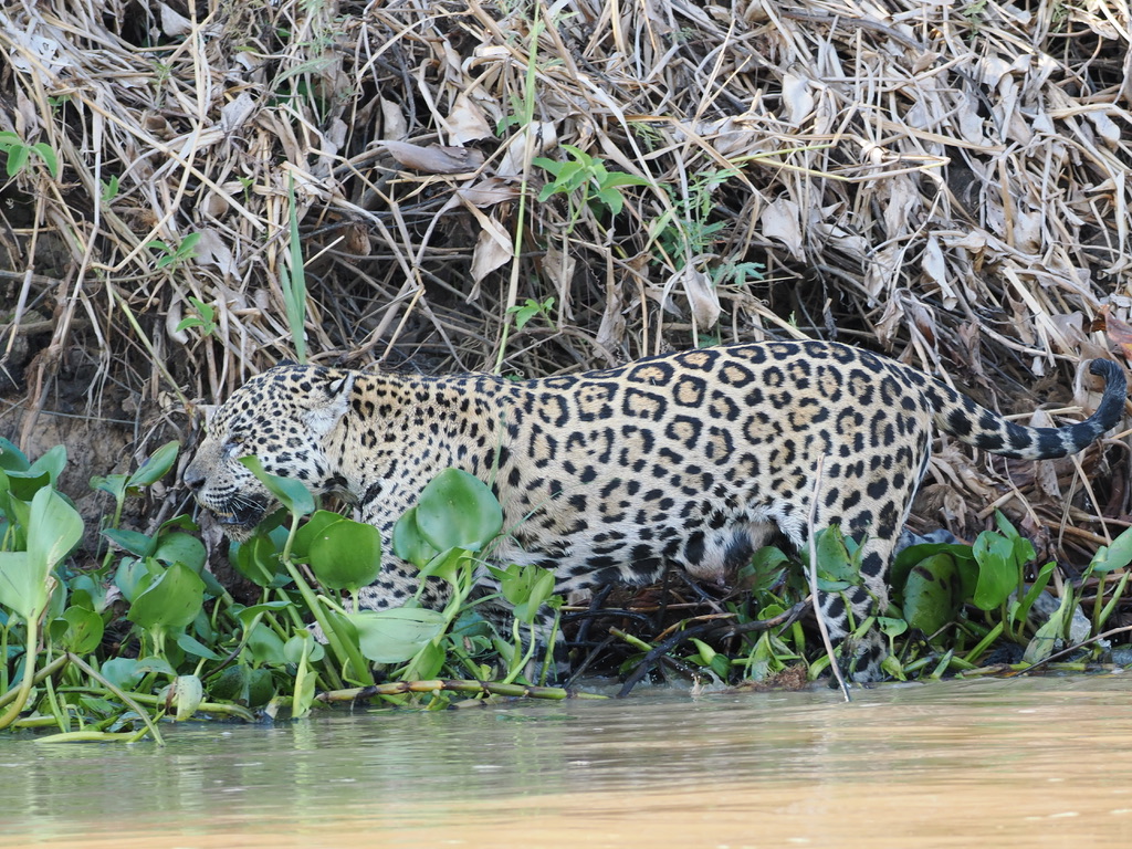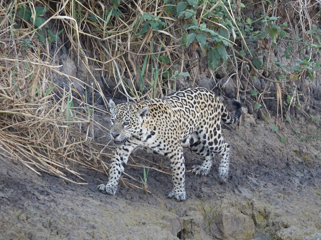 Mauro reçoit une communication radio et fait demi-tour à vive allure vers la rivière Cuiaba. Notre Jaguar 1 est proche. C’est une femelle nommée Patricia, observée régulièrement depuis 2012. Elle a des petits comme le montrent ses mamelles. Patricia remonte la berge suivie par une vingtaine de barques. Les jaguars ayant été habitués à la présence humaine par les scientifiques, l’animal ne semble pas perturbé, mais mon sentiment est mitigée. Je trouve que nous lui mettons trop de pression.