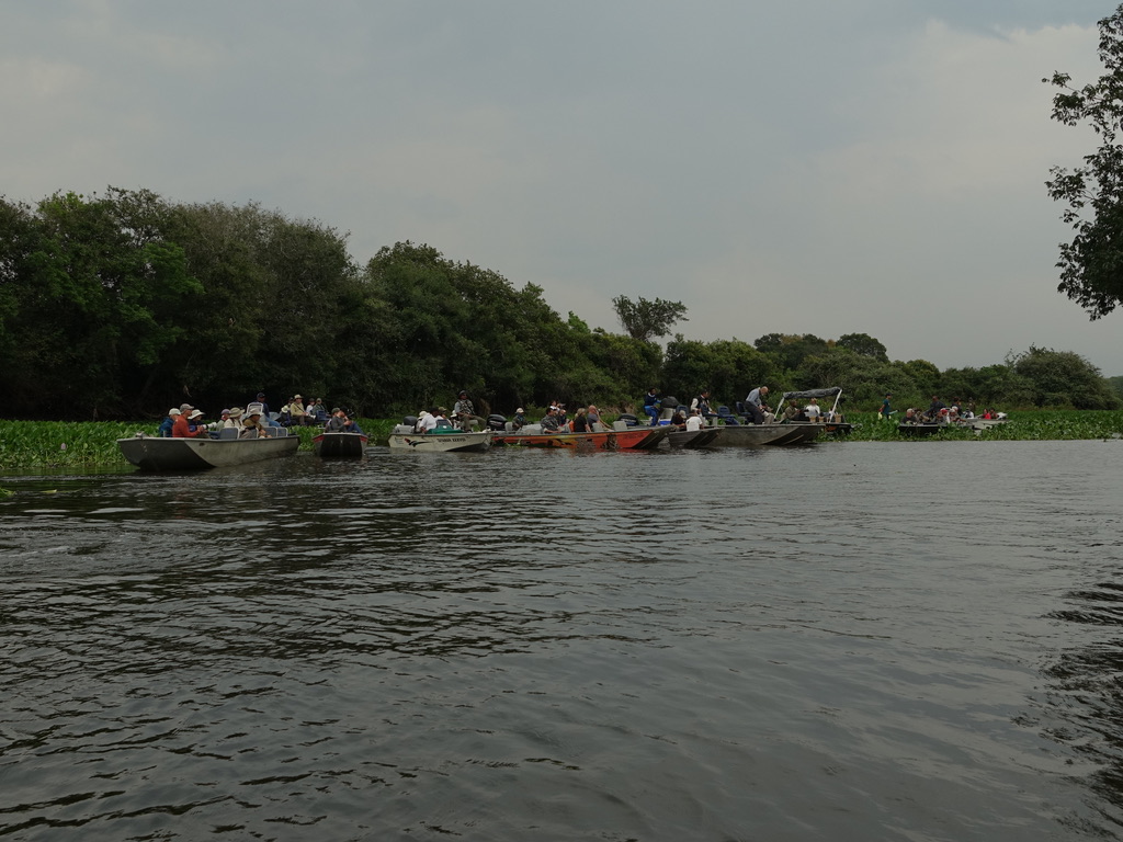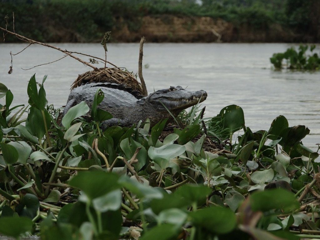 La température étant en baisse, nous quittons le Jaguar Suites dès 14 heures. Le temps est très menaçant, il y a peu de monde et nous naviguons 45 minutes sur la rivière Cuiaba. Les caimans sont de sortie.