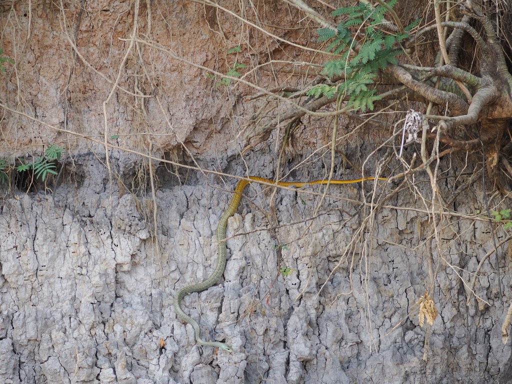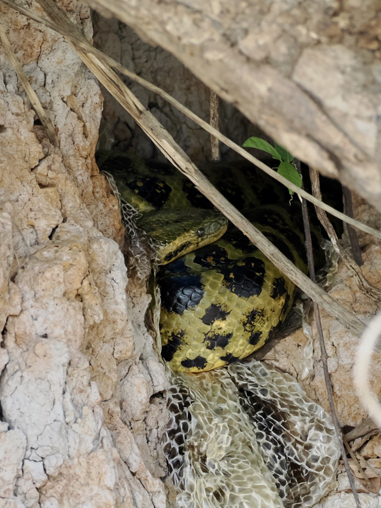 Second départ à 7h30. Nous descendons la rivière Cuiaba pour observer des serpents sur une berge escarpée. L’anaconda est niché dans un trou, sa mue bien visible. Un Neotropical Racer est en chasse.