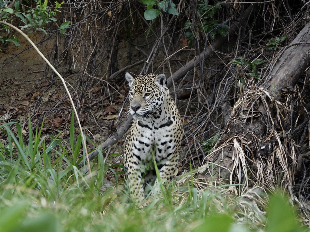 Notre jaguar (7) nous attend sur la rive. C’est Bruce, un gros mâle observé dans le secteur depuis 2019. Dans le Pantanal, un mâle peut peser 150 kg, contre 50 kg en Amérique centrale. Cette diffférence importance est due au poids des proies disponibles. Le mâle se distingue facilement de la femelle par l’aspect massif de sa tête.