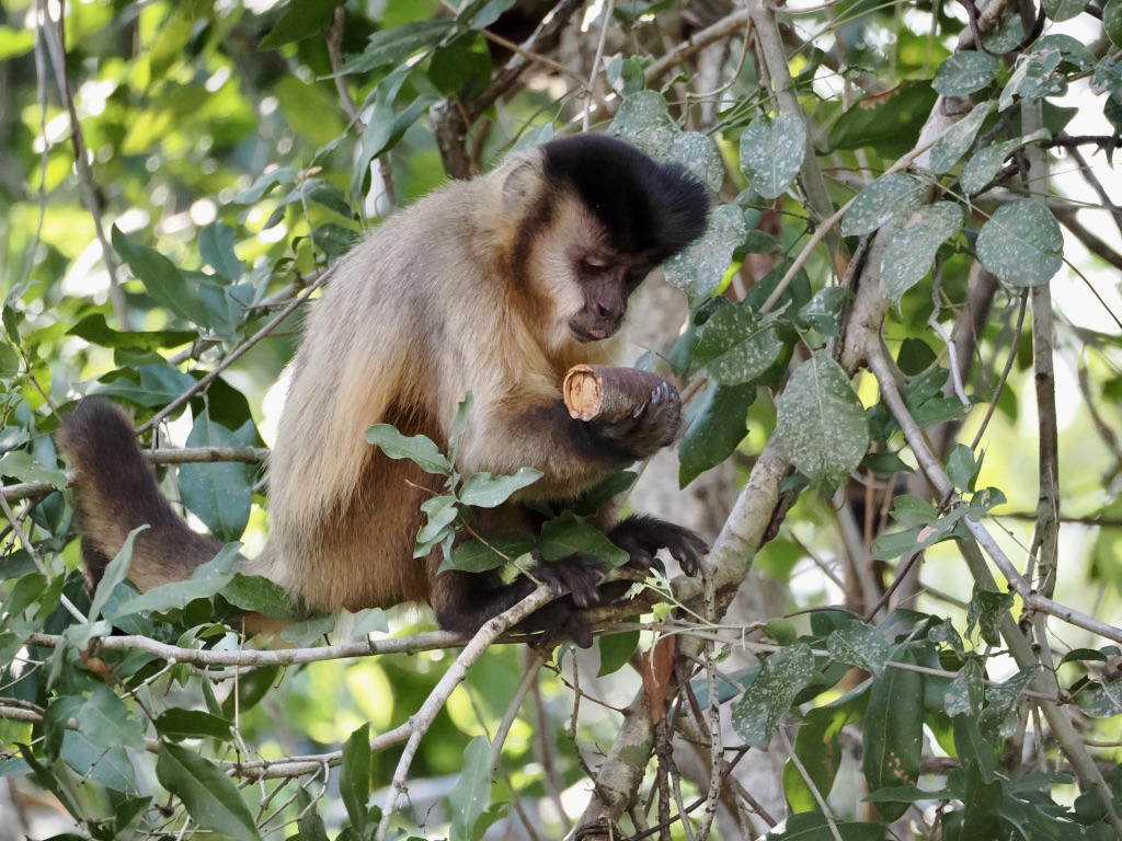 Il y a aussi des singes, notamment des capucins, comme celui-ci qui déguste tranquillement un fruit.