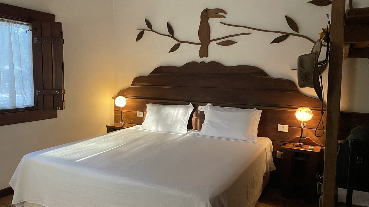Les 18 suites sont spacieuses, avec un rangement confortable. Le style rustique, utilisant le bois d’ipê, est typique du Pantanal. Ce sont les premières chambres de notre séjour bénéficiant de 2 fenêtres, ce qui permet de faire courant d’air, la nuit notamment. En utilisant aussi le ventilateur de plafond, c’est vraiment agréable.