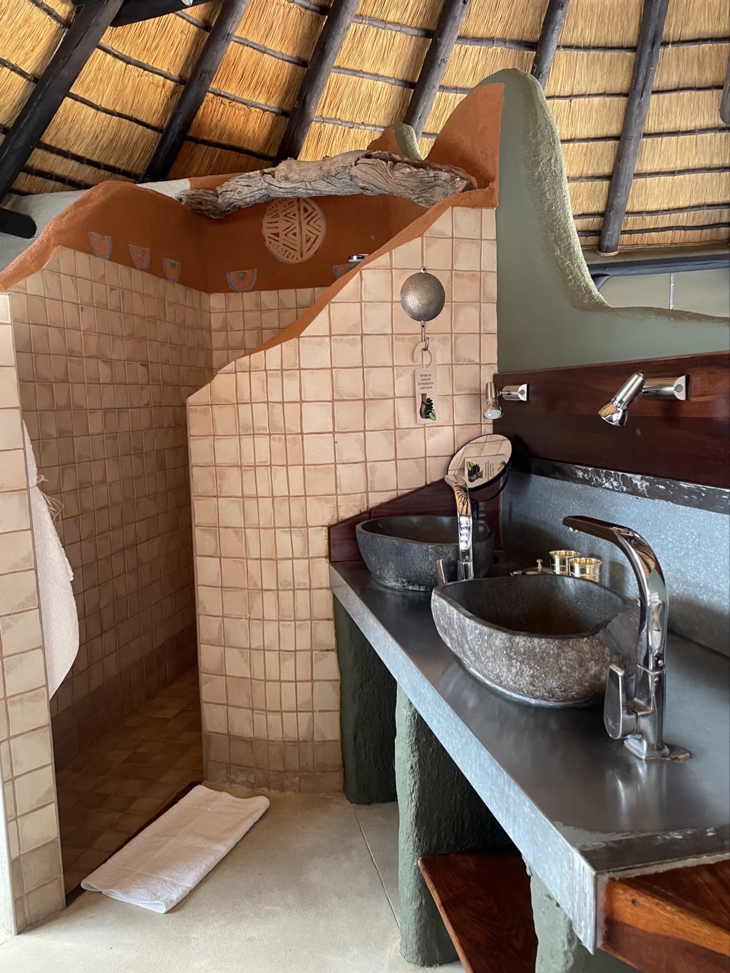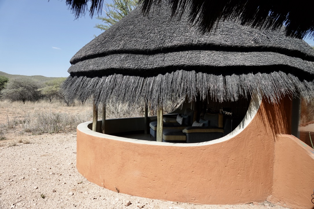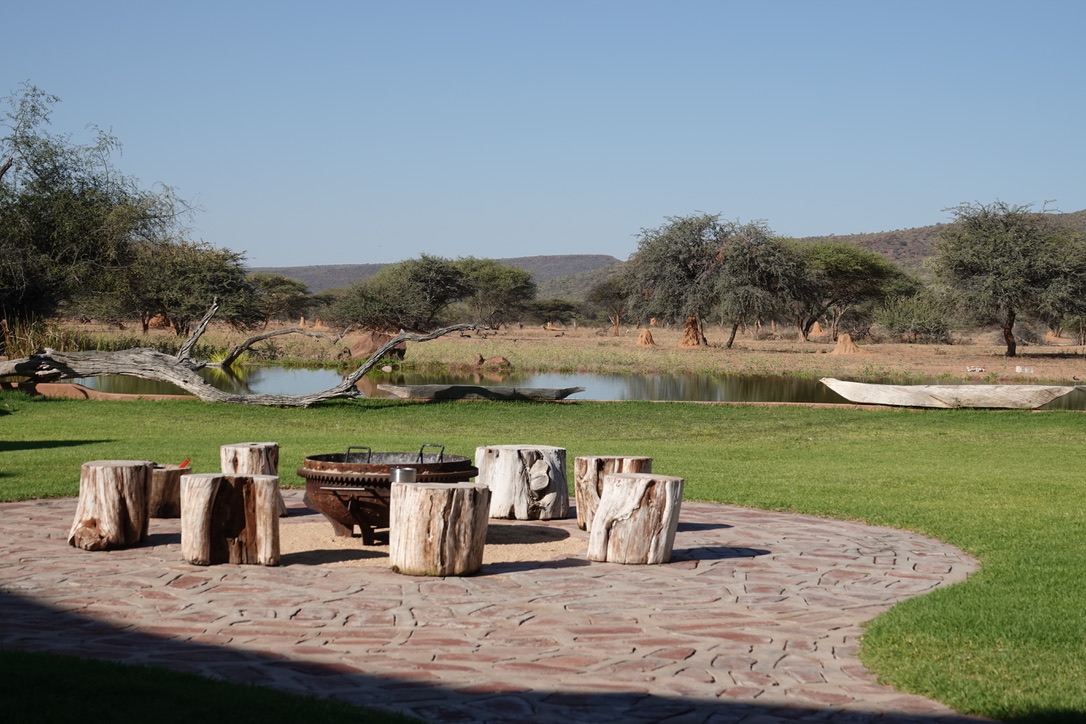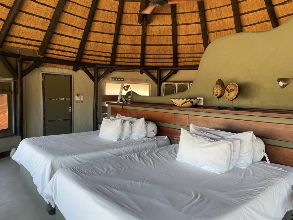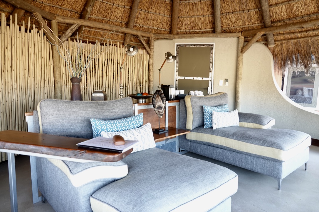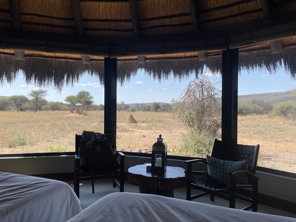 Notre chalet (n°1) dispose d’une « sala » largement ouverte sur l’extérieur, avec minibar, machine à café et bouilloire. Aucun risque puisque Okonjima est une zone exempte de paludisme.
