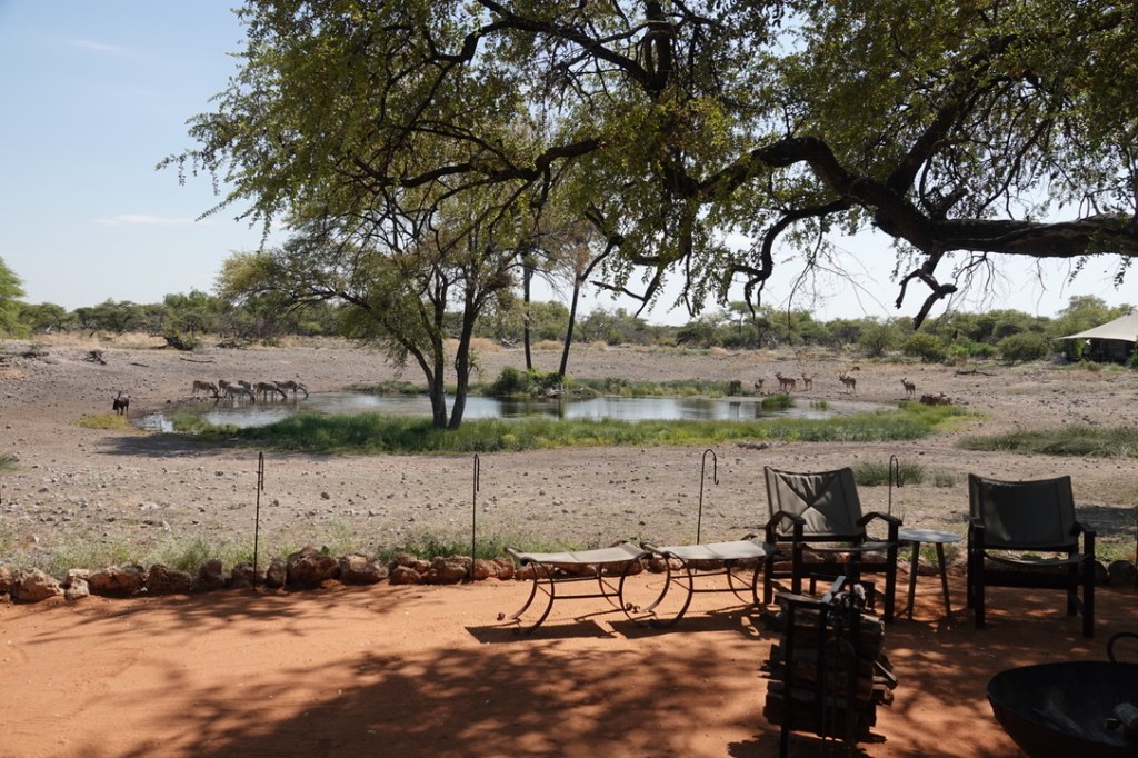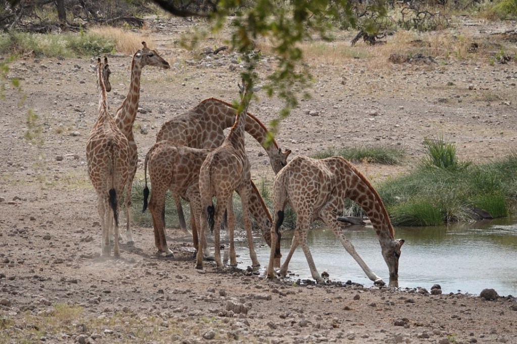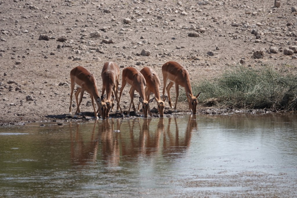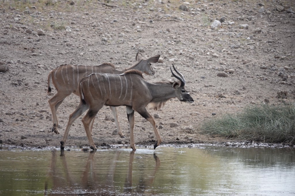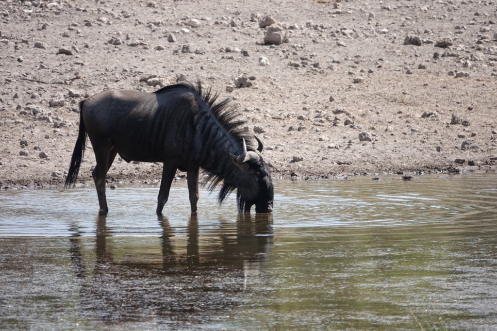 De nombreux animaux viennent au point d’eau tout au long de la journée : nous avons vu des koudous, de très nombreuses girafes, des zèbres, impalas et springboks et un gnou solitaire.