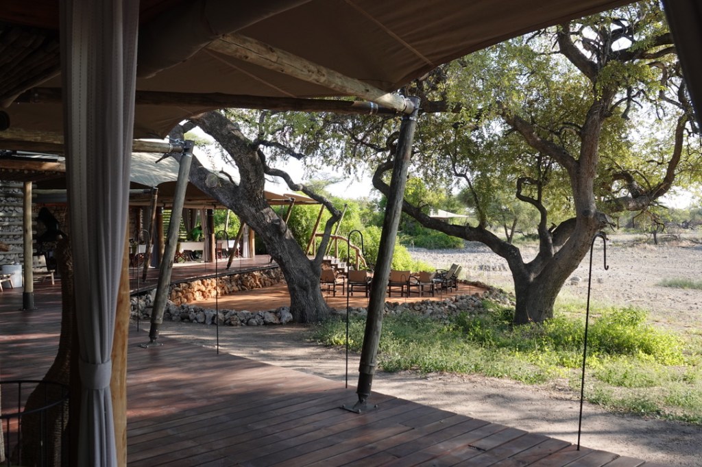 Dans la zone centrale de l’Onguma Tented Camp se trouvent la réception, le salon et la salle à manger. Un boma permet de discuter autour du feu en fin de journée.