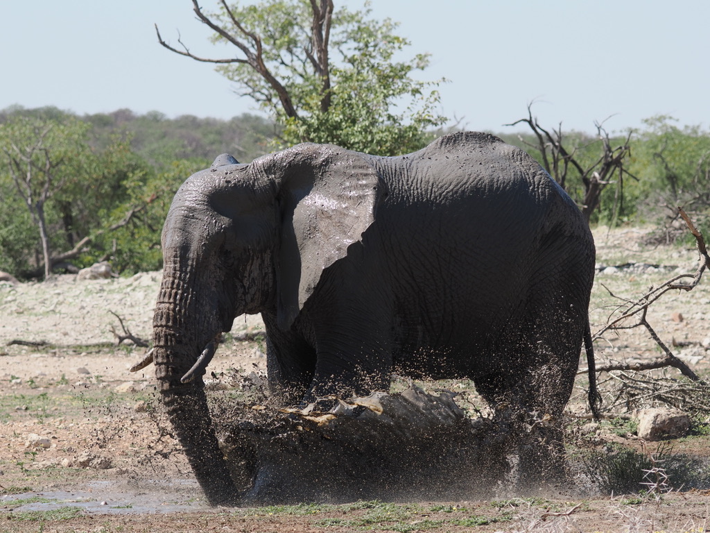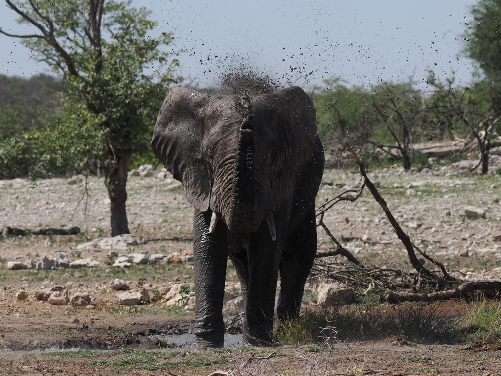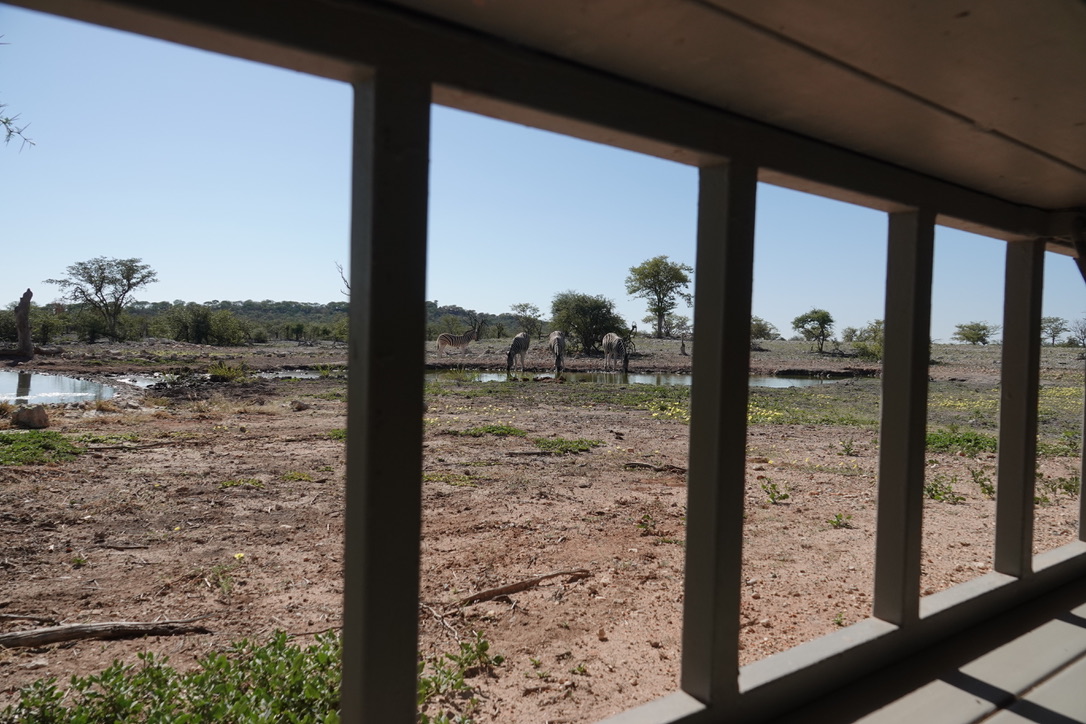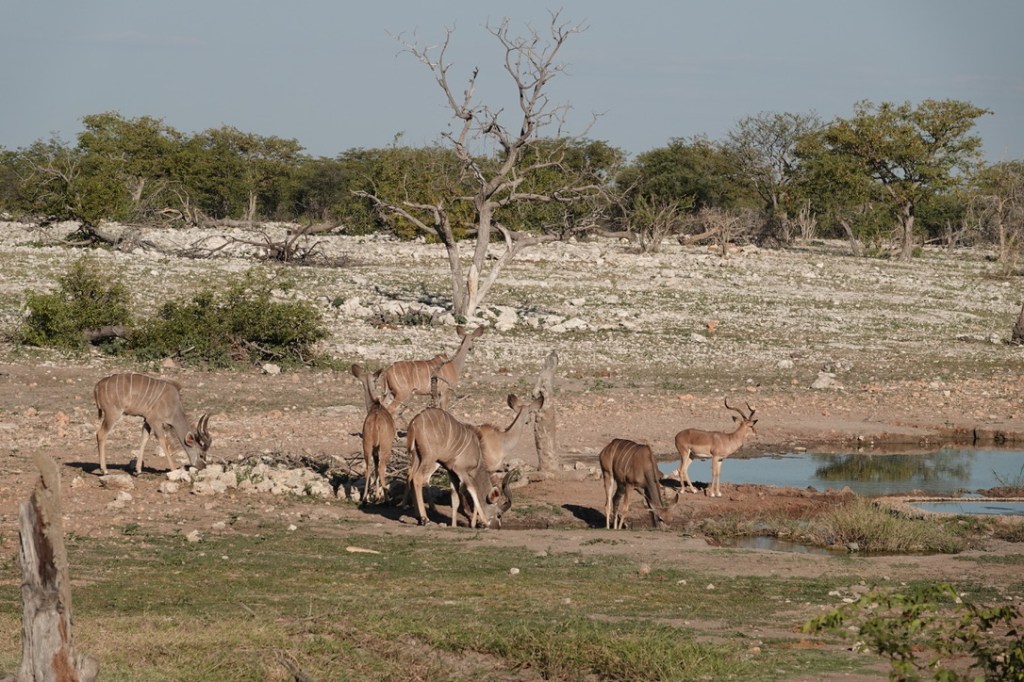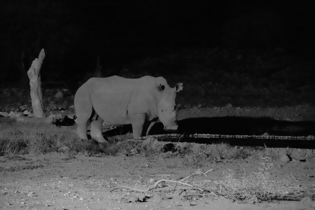 Le waterhole est fréquenté tout au long de la journée : herbivores en matinée, puis les éléphants au plus chaud de la journée, suivis par les rhinocéros à la nuit tombée, les prédateurs venant plus tard.