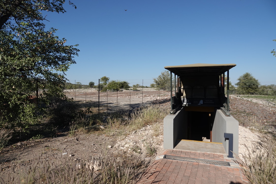 Une cache souterraine a été aménagée pour permettre de s’approcher discrètement des animaux. Les prises de vue au niveau du sol offre un angle intéressant. La caméra de surveillance du point d’eau est diffusée sur la TV de la chambre, pas besoin donc d’attendre dans la cache !