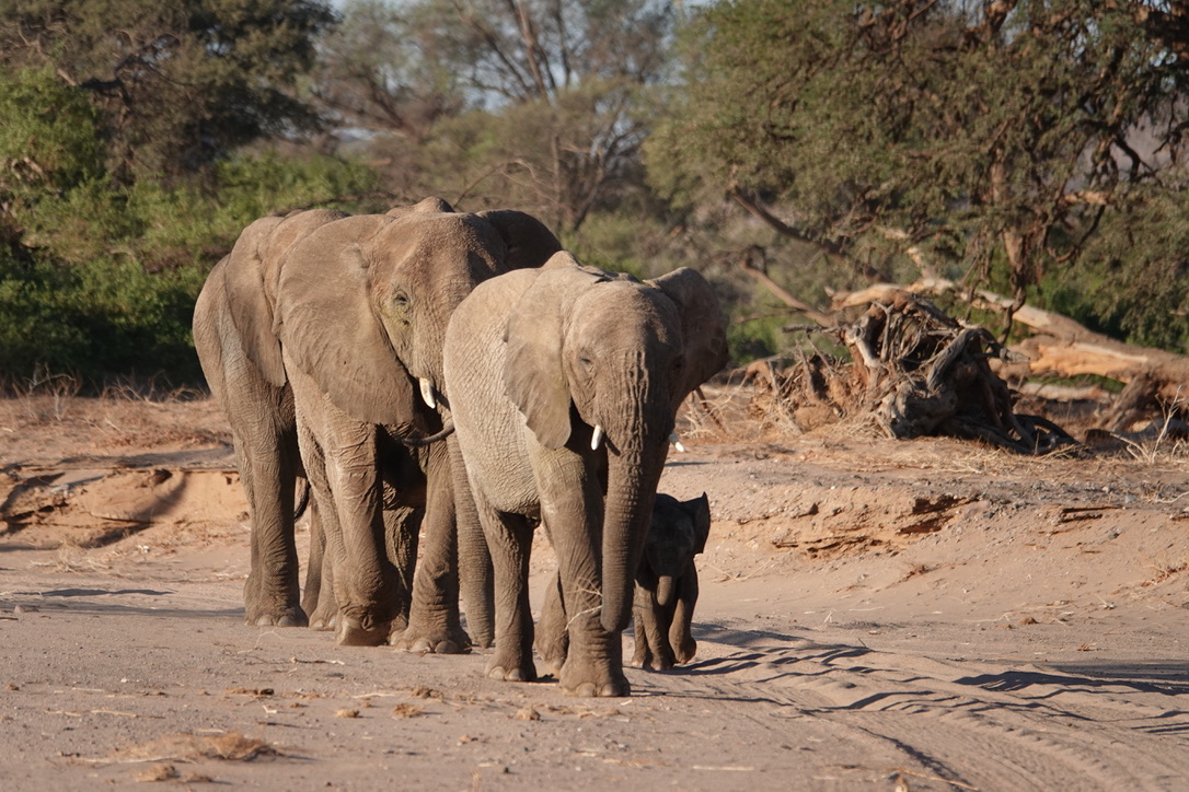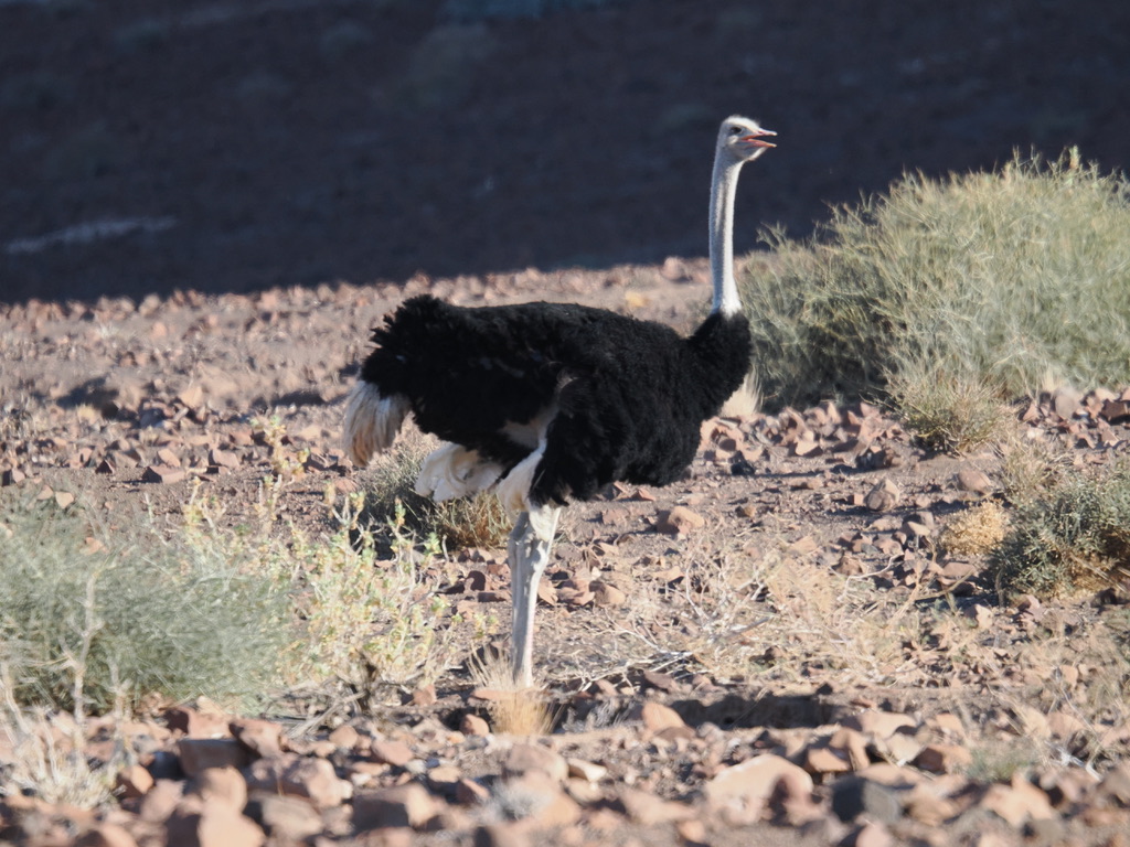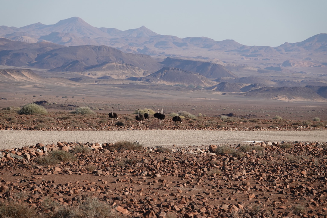 Au programme de notre premier après-midi, un drive dans la rivière Huab à la recherche des éléphants du désert. Nous commençons par croiser des autruches.