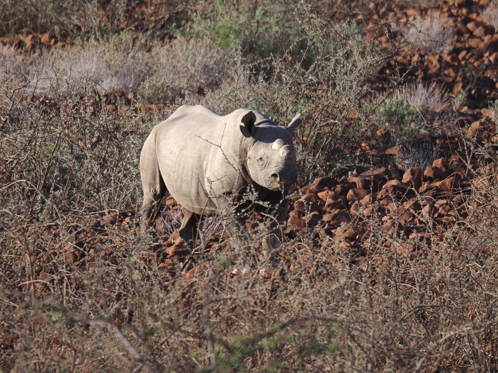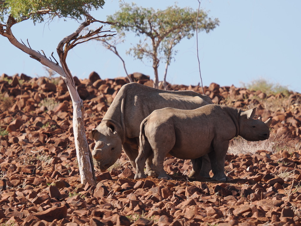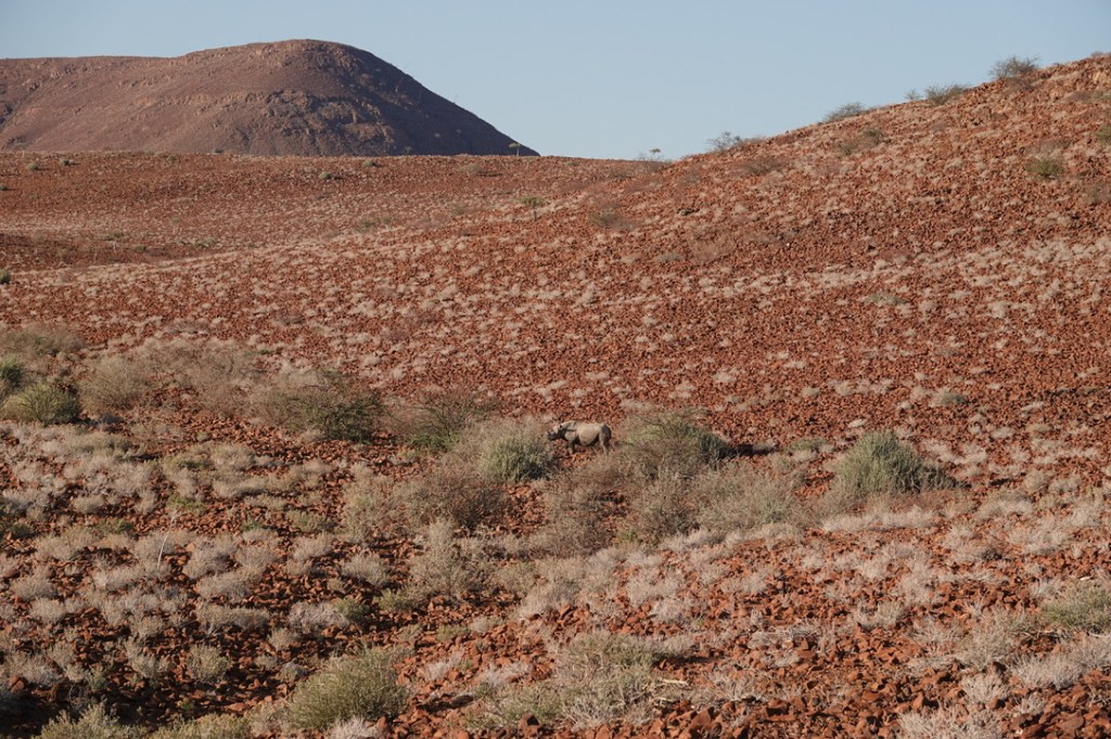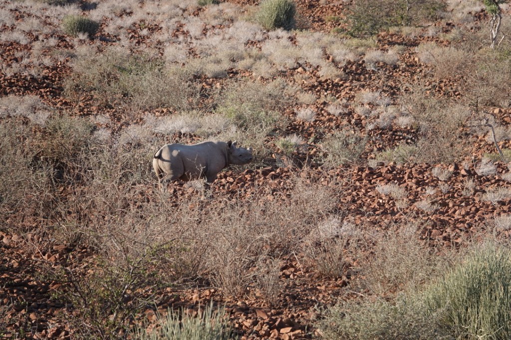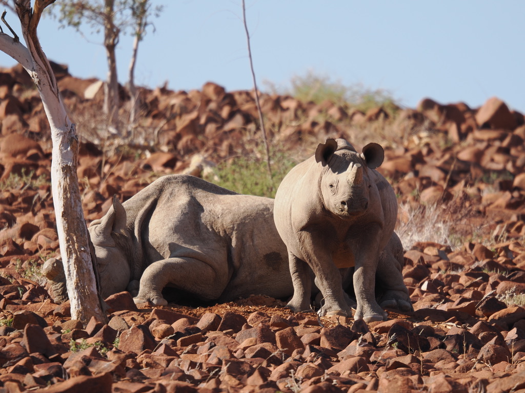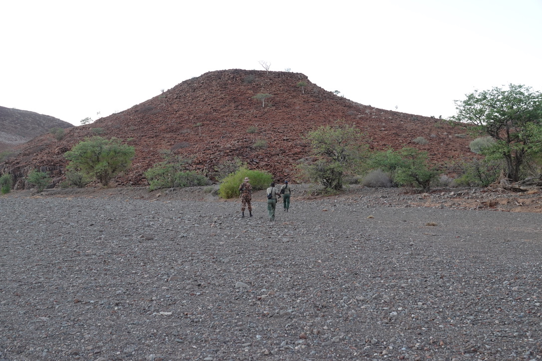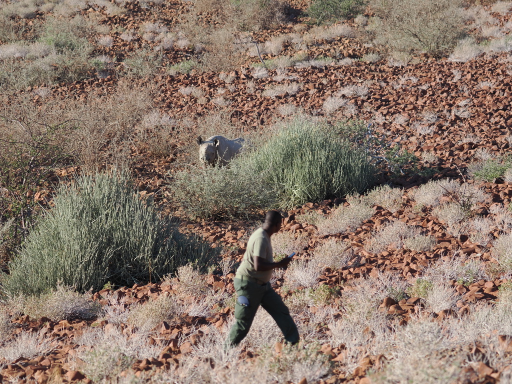 Nous avons environ 1 heure de piste vers le nord pour aller chercher deux pisteurs de l’Association Save the Rhino Trust. Save the Rhino Trust est une ONG impliquée en Namibie dans la protection des rhinocéros noirs. Les pisteurs sont issus des communautés locales et possèdent une connaissance approfondie des rhinocéros comme de leur environnement. Ils patrouillent quotidiennement dans une zone de 25 000 km2 avec un double objectif : collecter des données, dissuader les braconniers.