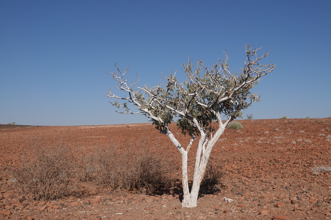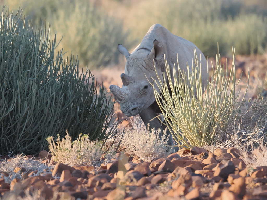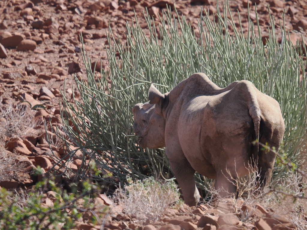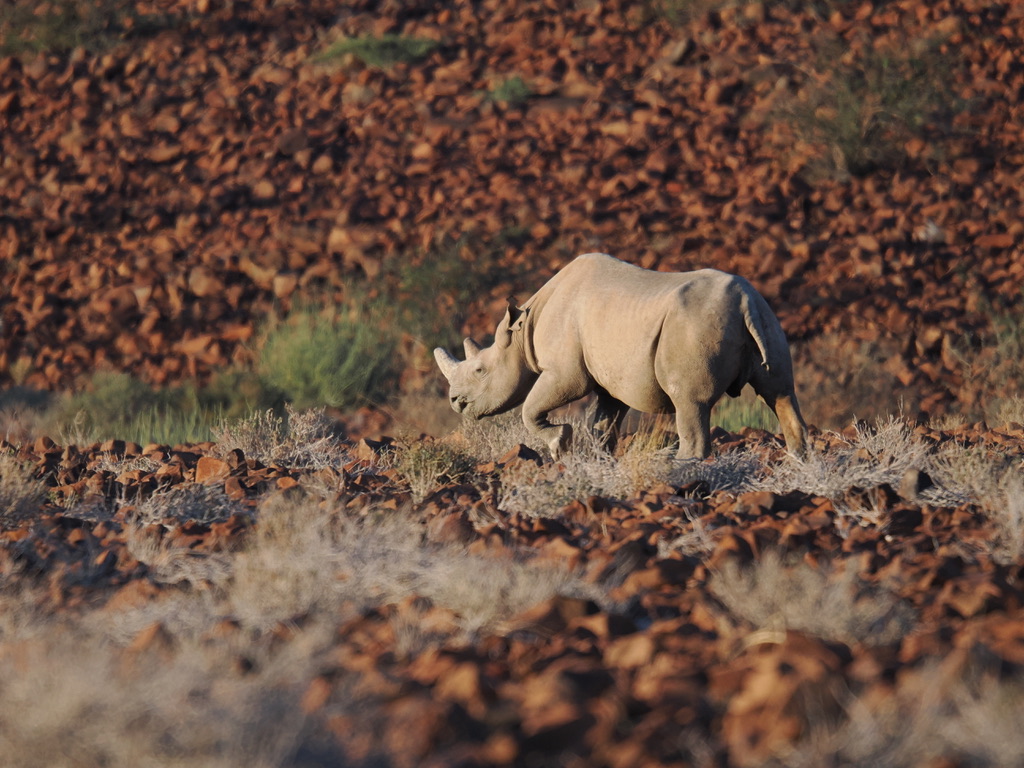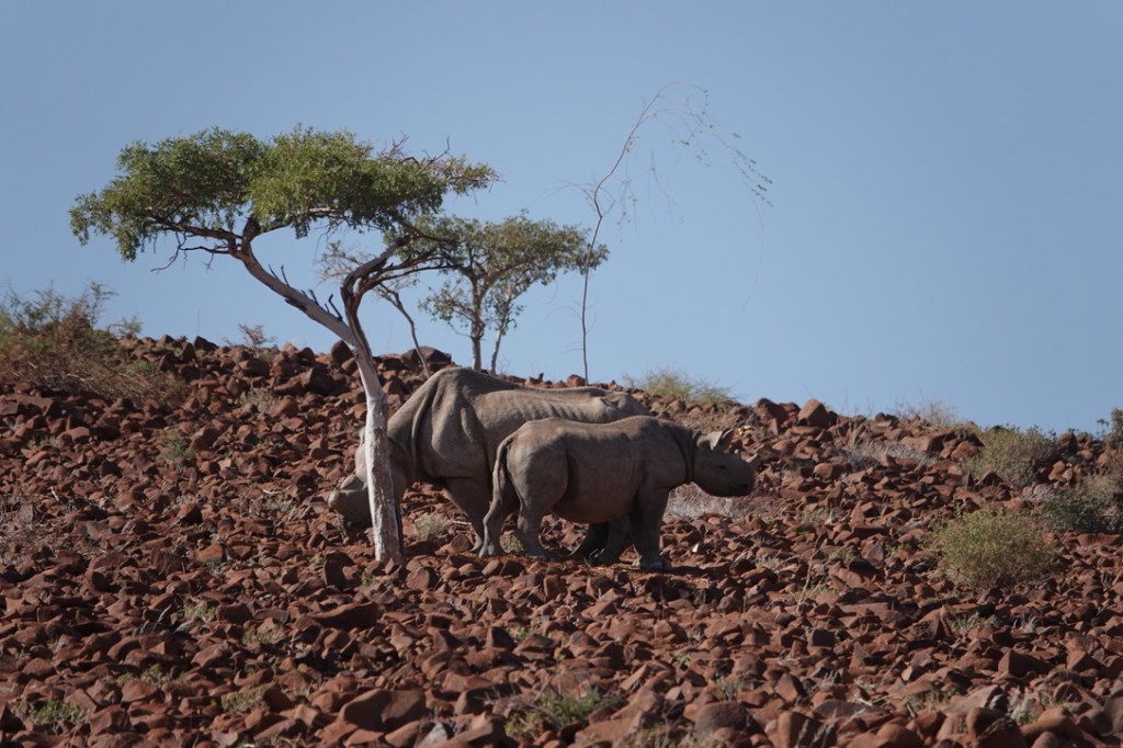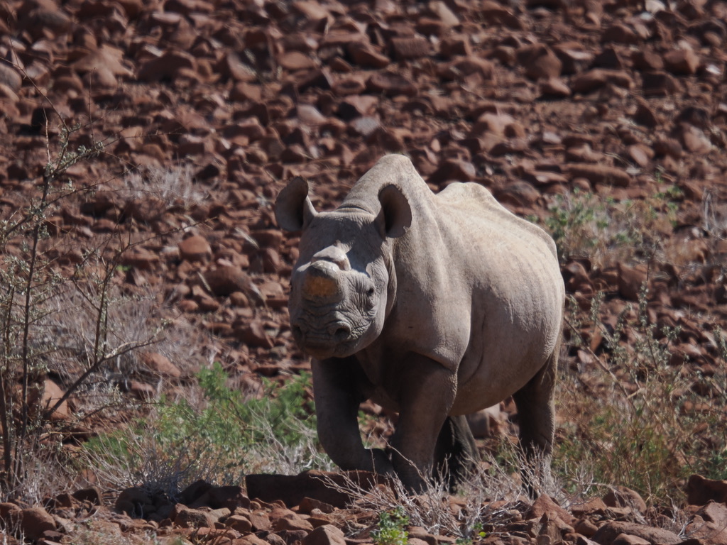 Nous avons environ 1 heure de piste vers le nord pour aller chercher deux pisteurs de l’Association Save the Rhino Trust. Save the Rhino Trust est une ONG impliquée en Namibie dans la protection des rhinocéros noirs. Les pisteurs sont issus des communautés locales et possèdent une connaissance approfondie des rhinocéros comme de leur environnement. Ils patrouillent quotidiennement dans une zone de 25 000 km2 avec un double objectif : collecter des données, dissuader les braconniers.