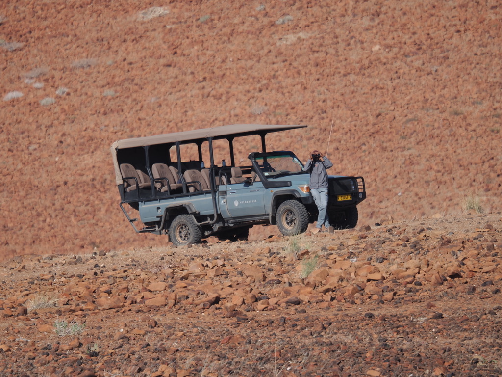 Nous devions initialement séjourner au Desert Rhino Camp, qui est en cours de rénovation. Notre activité de rhino tracking a été maintenue depuis Damaraland Camp. Nous partons à 05:45, bien avant le lever du soleil donc. Les ponchos fourrés sont appréciés !