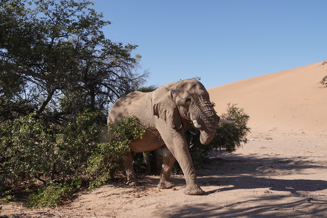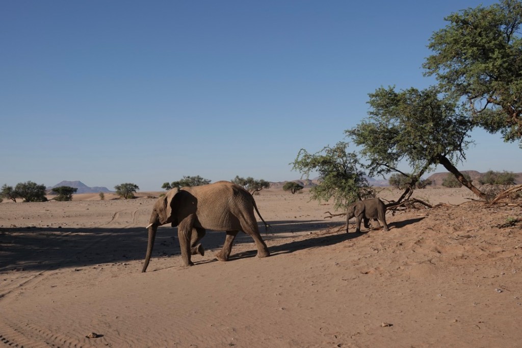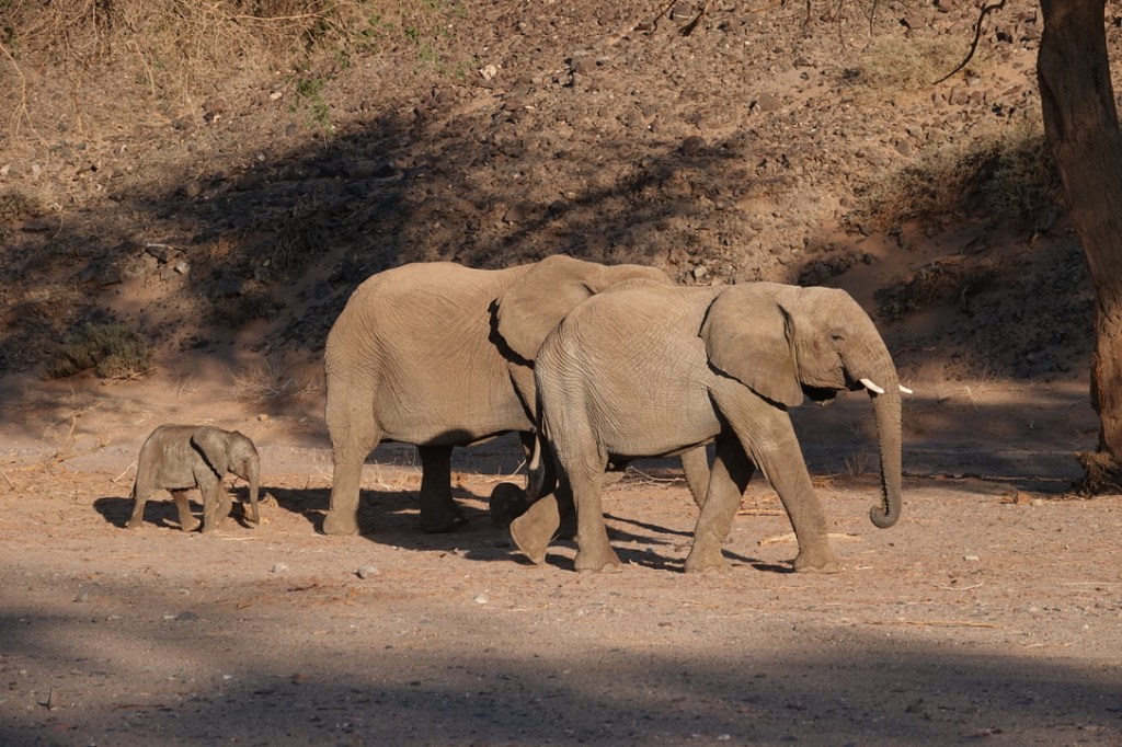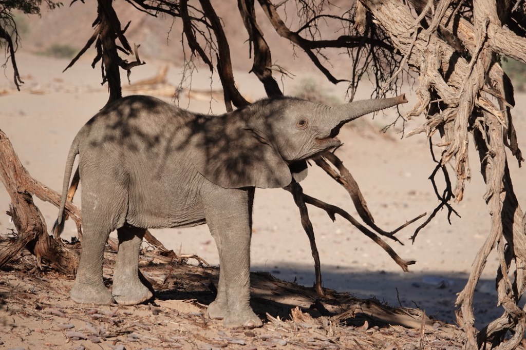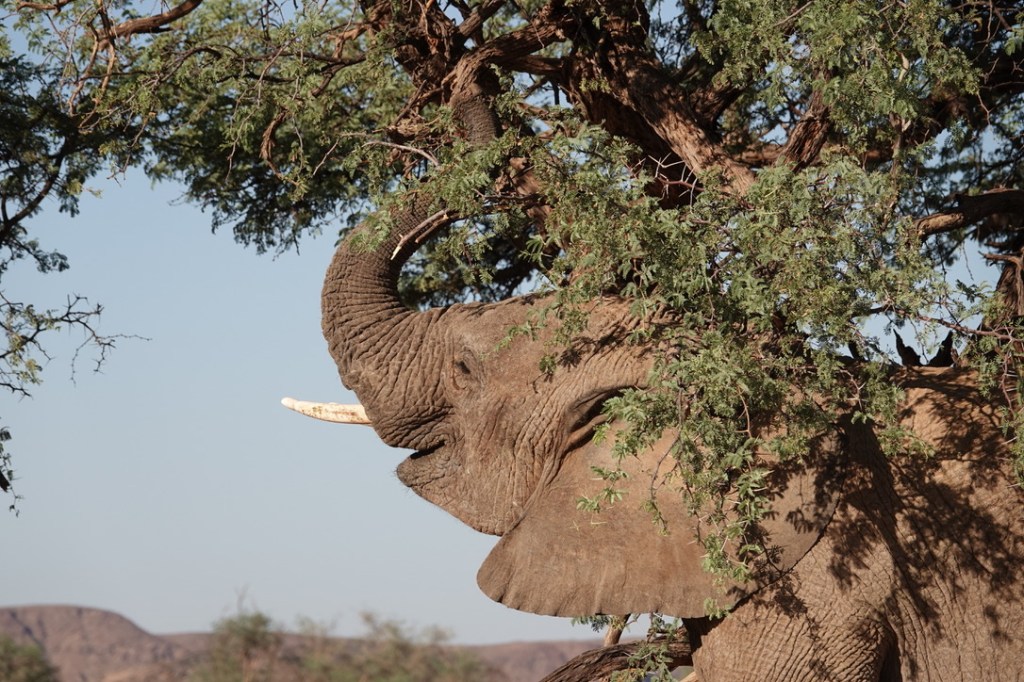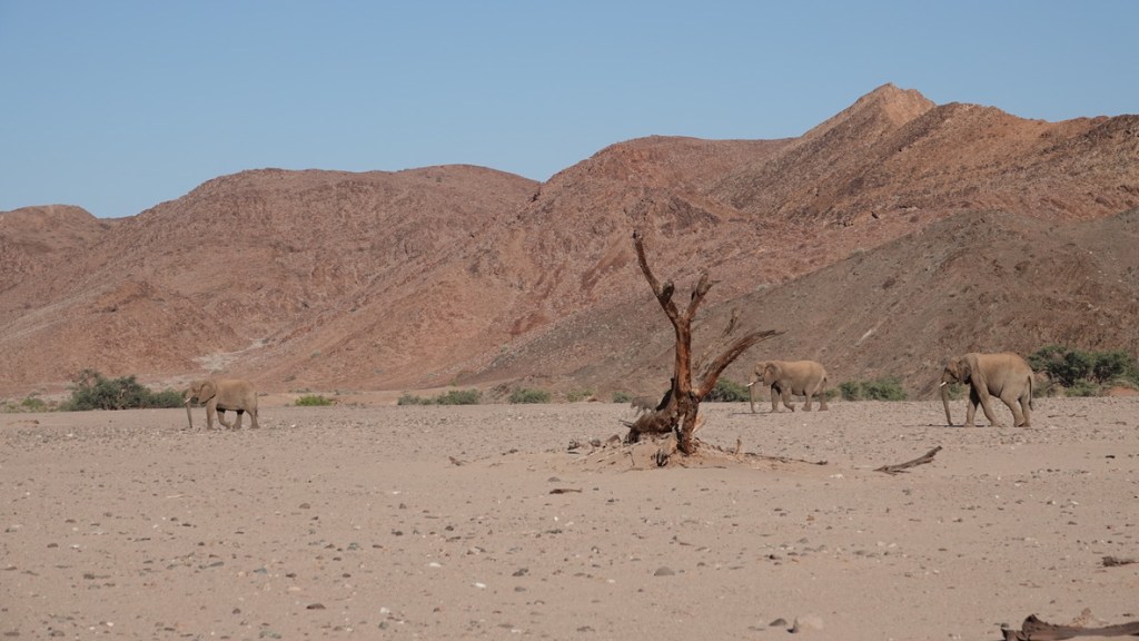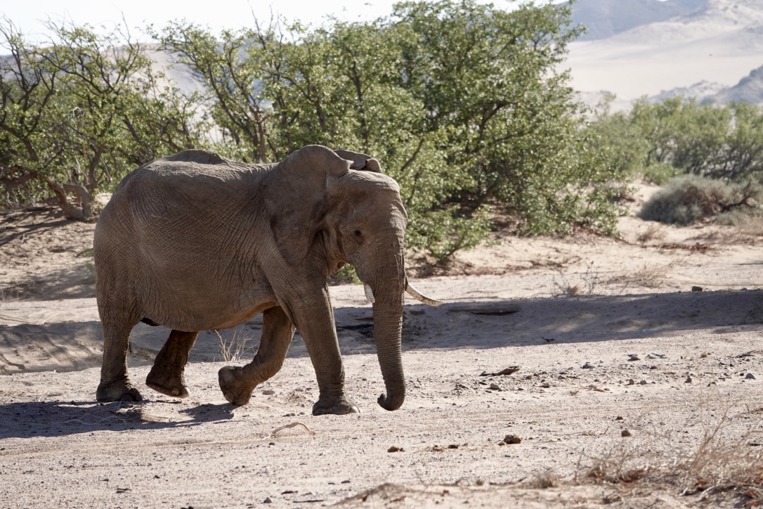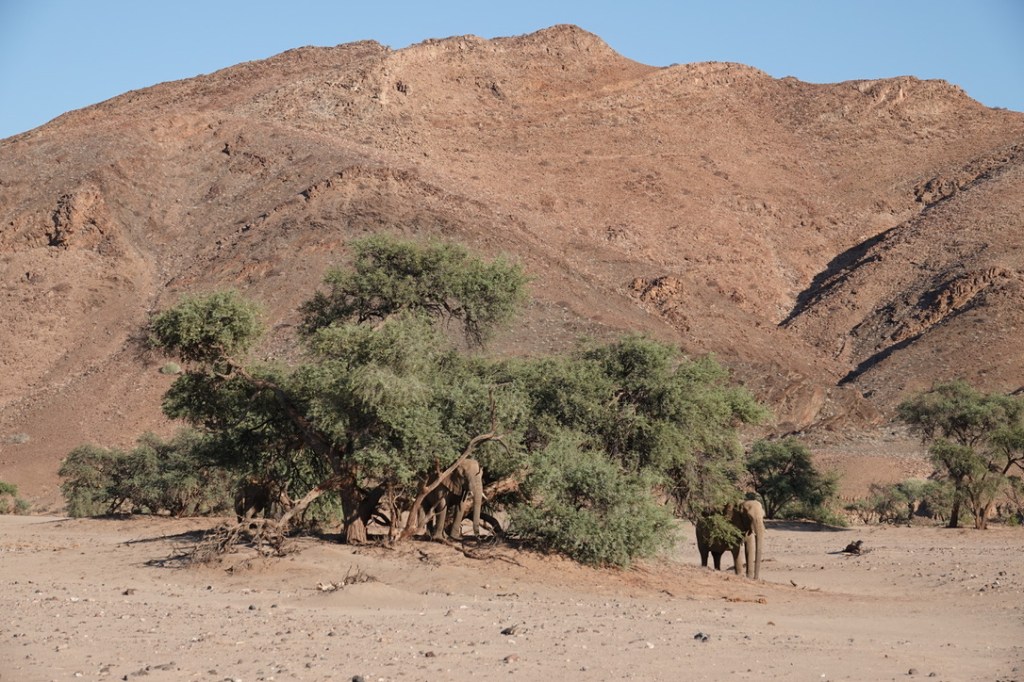 C’est dans les vastes espaces du Damaraland que l’on peut croiser les éléphants du désert, dont le nombre est estimé à 150 individus.