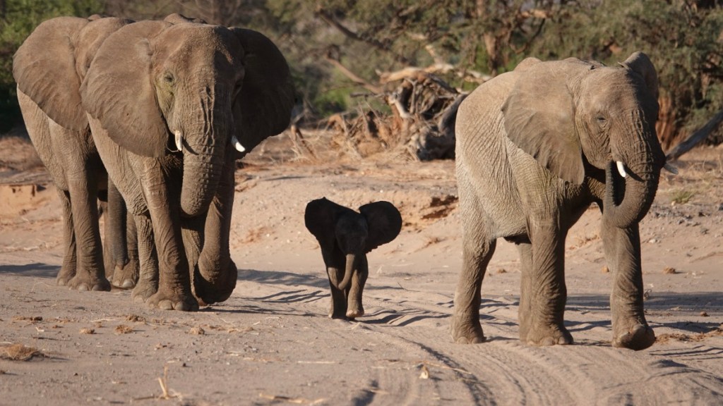 À part en pleine saison des pluies, les rivières sont sèches. Mais l’eau coule sous la surface et les éléphants creusent pour l’atteindre. Un éléphant ayant besoin de 100l d’eau par jour, les familles parcourt jusqu’à 70 kilomètres pour trouver de l’eau. Par forte chaleur, elles marchent de nuit.
