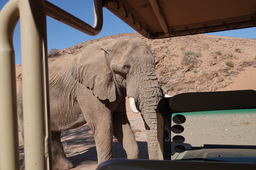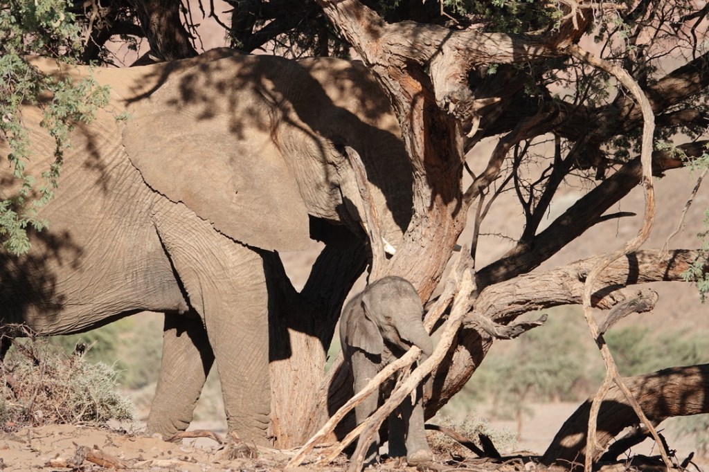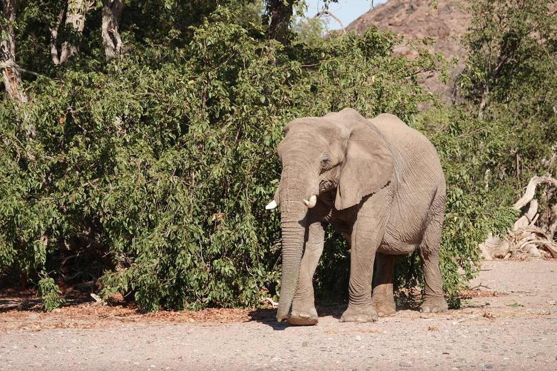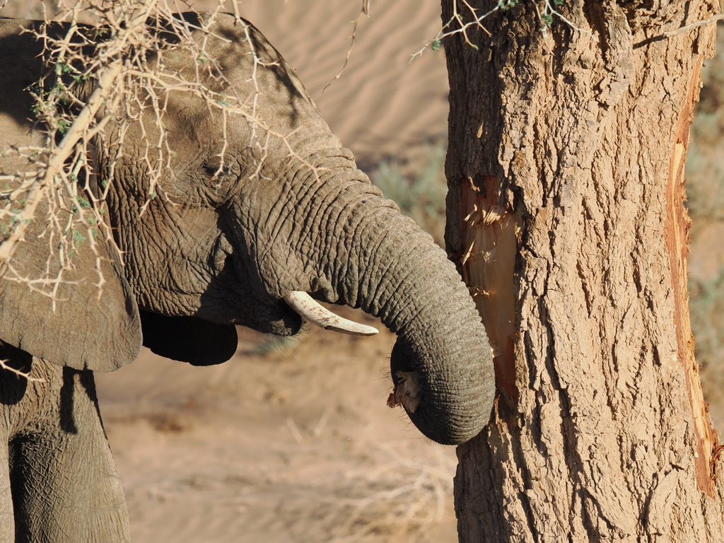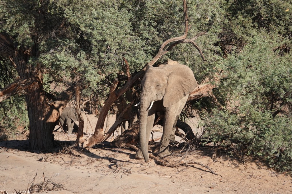 Nous avons eu 2 occasions de rencontrer les éléphants. La première lors d’un afternoon drive depuis le Damaraland Camp. Joas nous a conduit dans le lit de la rivière Huab. Une lecture de traces et nous voilà devant une petite famille, avec un éléphanteau. Un jeune mâle suit à distance. Les adultes se nourrissent de tout ce qu’ils trouvent en chemin – graines, écorces…