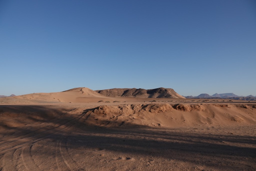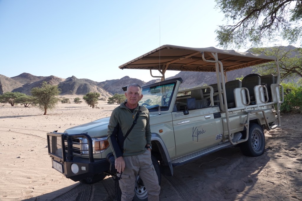 Seconde possibilité avec Siegfried (dit Siggi), guide du Camp Kipwe. Nous partons tôt le matin dans les lits asséchés des rivières Huab et Aba-Huab. Siggi a fait une démonstration magistrale de tracking pour nous conduire aux mêmes éléphants ! Ils sont à l’écart de la rivière, dans une plaine où les bosquets sont nombreux.