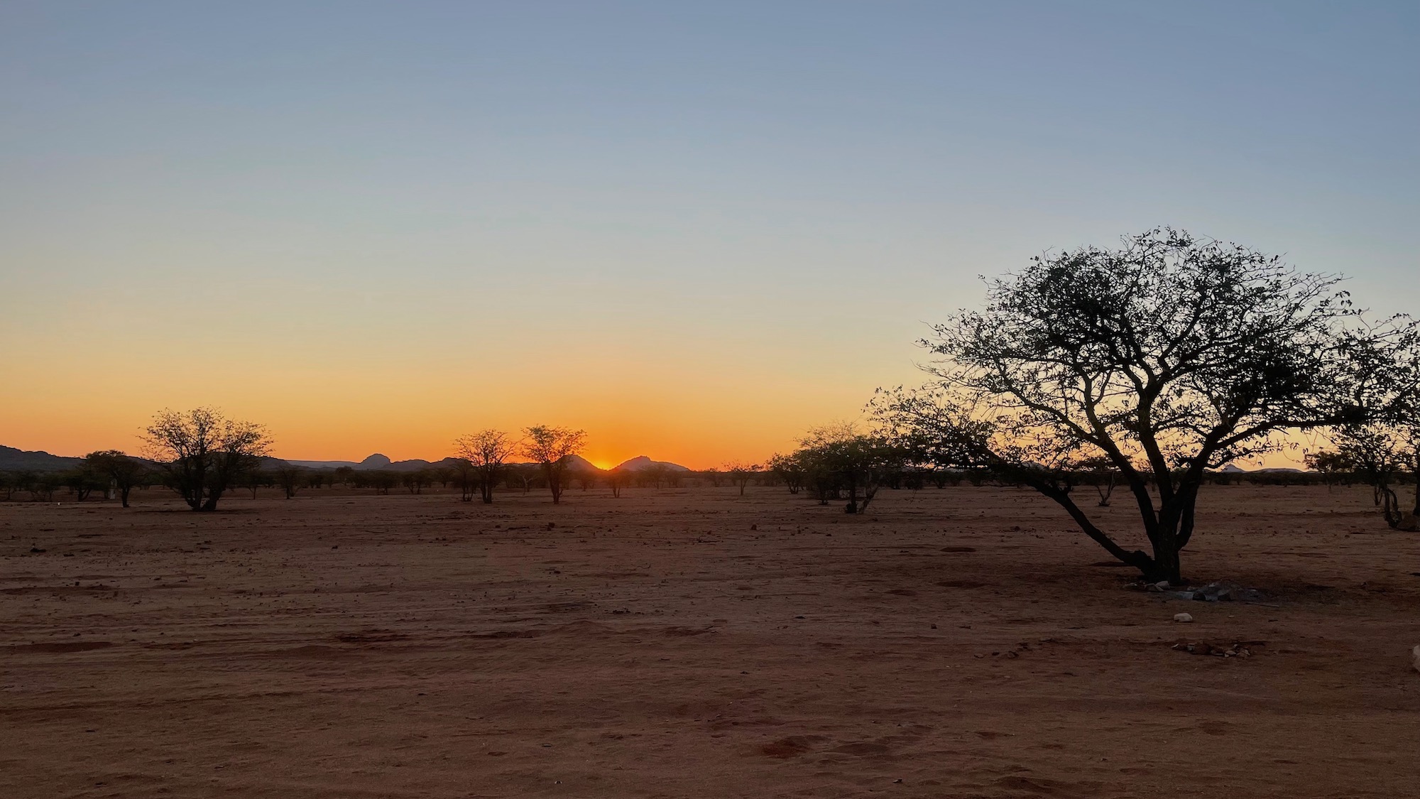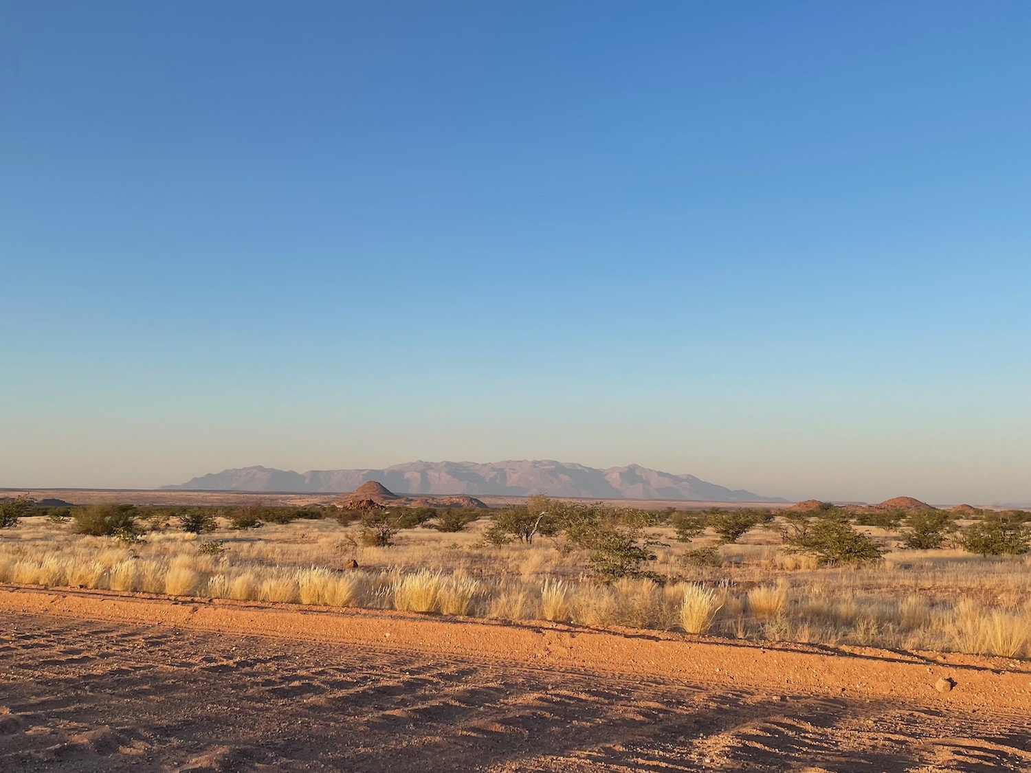 Nous partons au lever du soleil pour éviter la grosse chaleur. Nous prenons la piste D2612 avec un peu d’appréhension car plusieurs personnes nous l’ont qualifiée d’horrible. Il n’en est rien, le paysage est superbe et la piste juste un peu ondulée par endroits. Elle est étroite mais nous n’avons croisé aucun autre véhicule avant de rejoindre la C35 qui file vers le sud. Le massif du Brandberg sur la droite est un joli arrière plan.