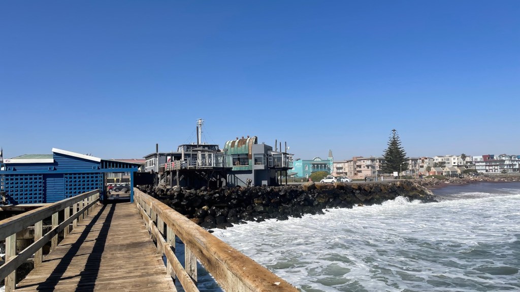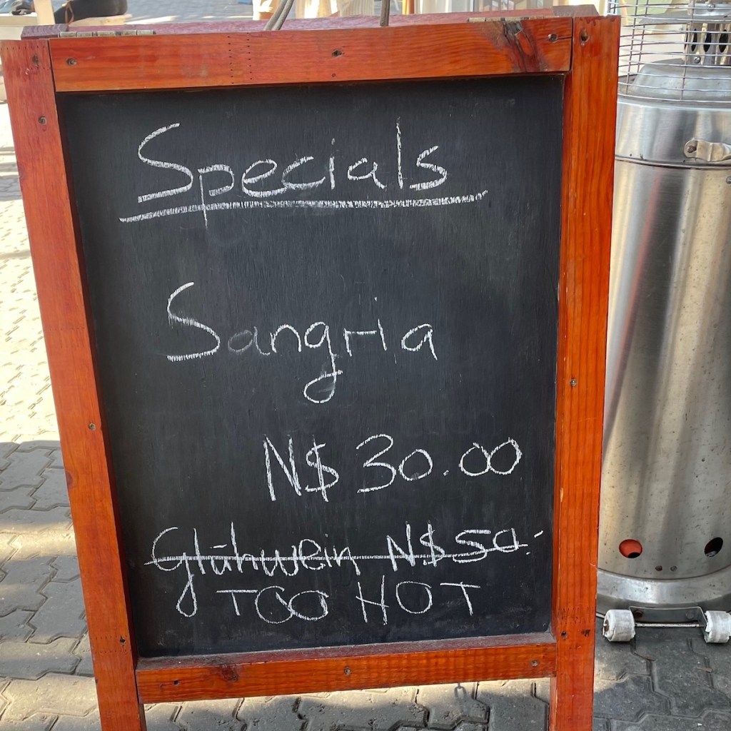 Il est très facile de s’orienter et le centre-ville est « safe ». Nous faisons un peu de shopping cet après-midi, passons un moment dans une belle librairie et visitons un magasin d’artisanat namibien. L’ambiance est détendue, les touristes font des emplettes et les locaux mangent des glaces. Il fait trop chaud pour le glühwein ! 🙂 Nous revenons par la promenade du bord de mer.