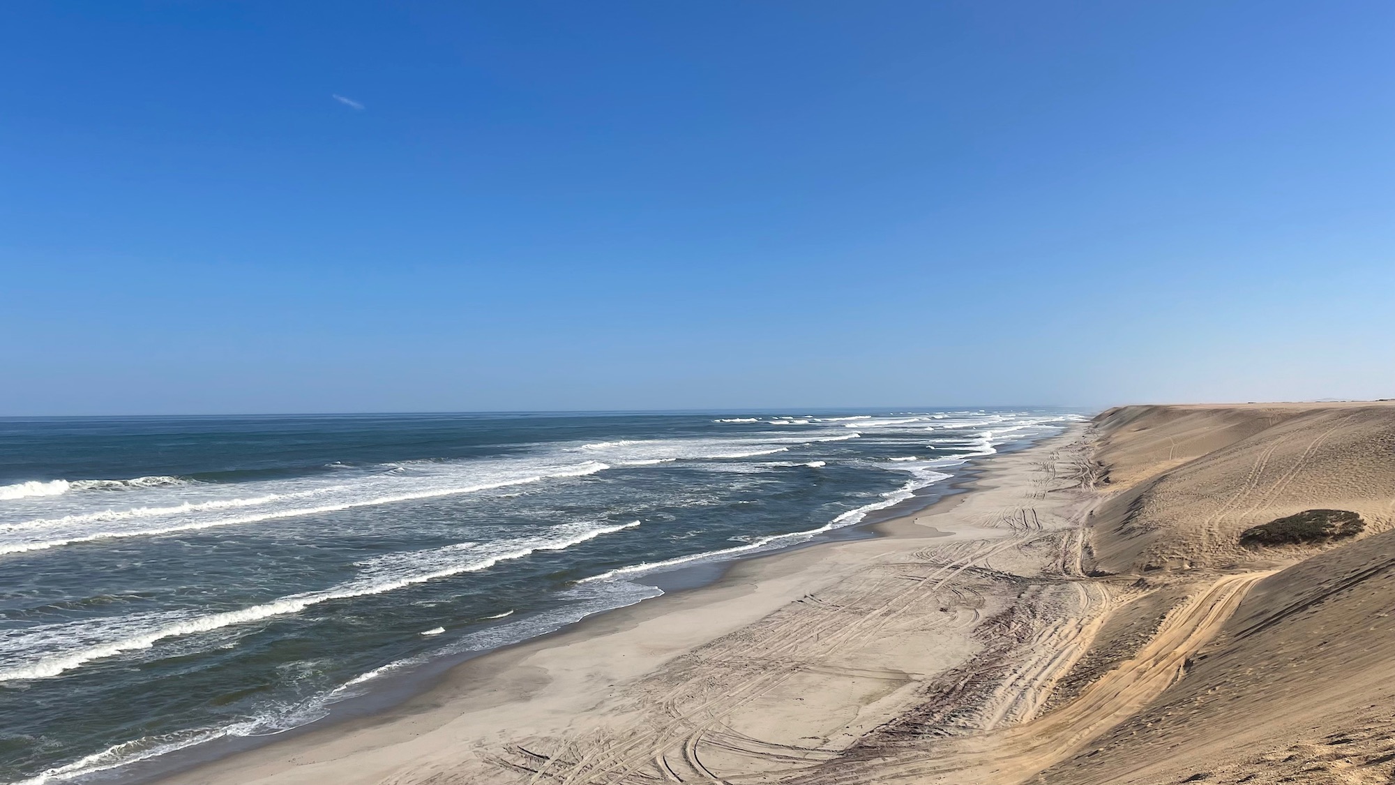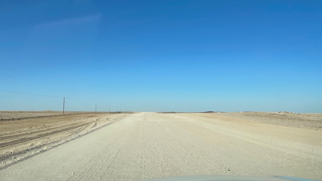 Après la ville minière d’Uis, la C35 porte bien son surnom de « desolation road » : toute droite, absolument rien à voir aux alentours. Nous retrouvons le bitume peu avant Henties Bay.
