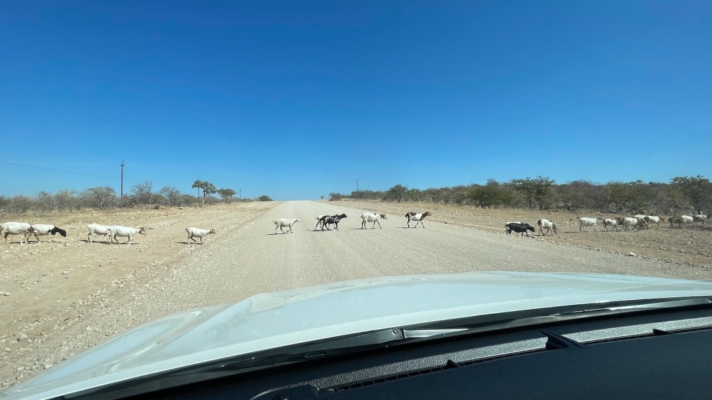 Une spécificité du pays est le passage d’une barrière vétérinaire entre le nord (Kaokoland) et le sud du Pays. Le bétail au nord du pays peut être sujet à des crises de fièvre aphteuse. Le cordon sanitaire permet d’éviter toute contamination vers le sud, qui aurait comme effet désastreux l’arrêt des exports de viande. Il est donc interdit de transporter de la viande crue et du lait non pasteurisé du nord vers le sud. Passer le poste vétérinaire implique de montrer ses papiers d’identité et son permis de conduire, d’ouvrir son coffre et sa glacière pour permettre à l’officier de vérifier qu’il n’y a pas de produit interdit.