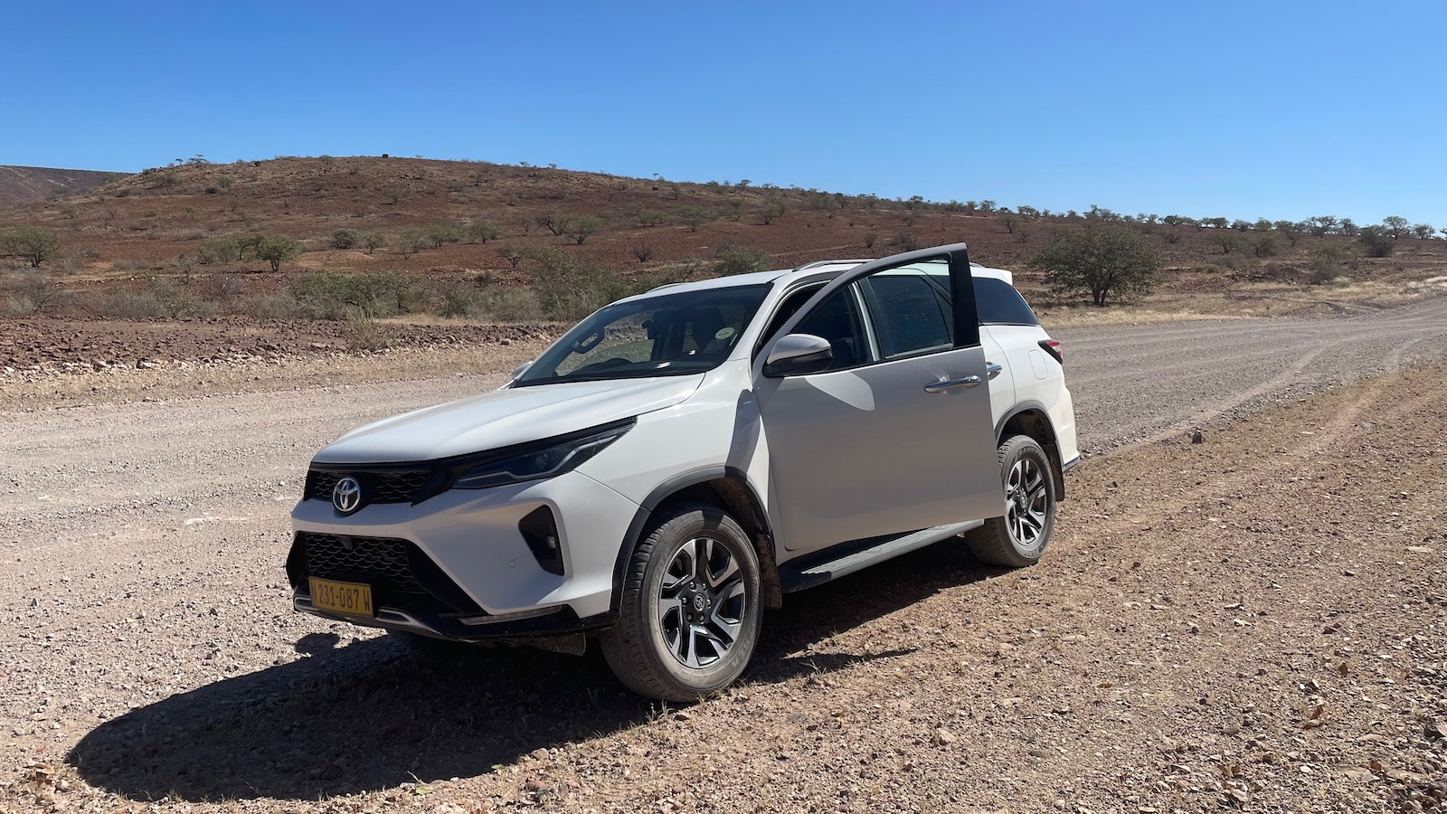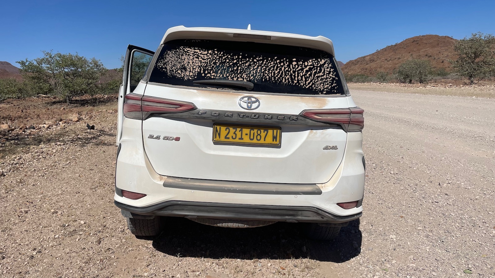 Le bon véhicule pour visiter la Namibie est assurément le 4×4, plus confortable et plus polyvalent qu’une voiture de ville, avec un gros réservoir d’essence (650 km d’autonomie pour le Fortuner). Même si les routes et pistes principales sont tout à fait praticables avec seulement 2 roues motrices. Choisir une boite automatique facilite aussi la conduite (pas besoin de passer les vitesses avec la main gauche)… et oui, on roule à l’anglaise en Namibie !