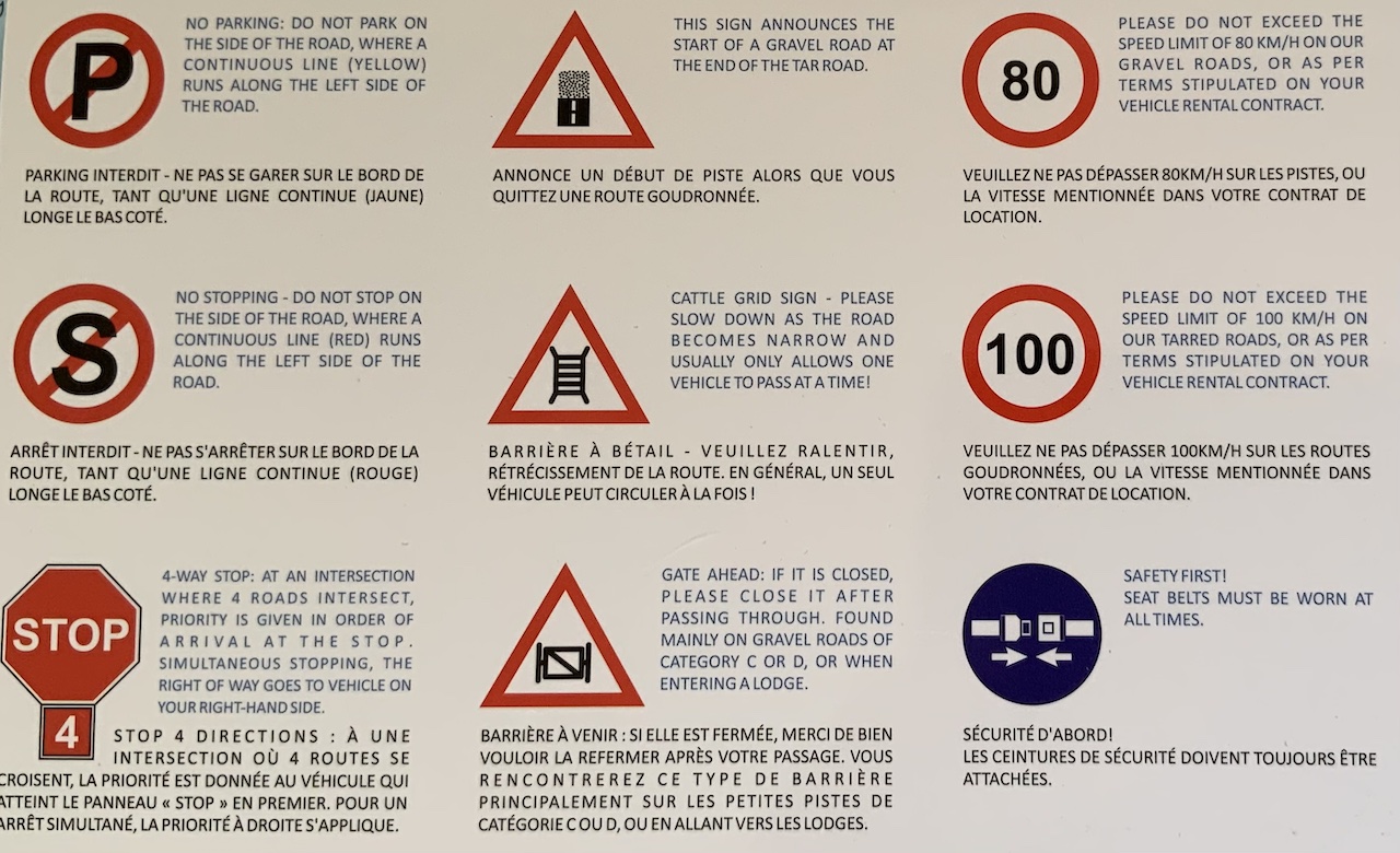 B pour les routes principales goudronnées, C pour les pistes principales (parfois goudronnées comme autour de Twyvelfontein). Les pistes secondaires D sont plus étroites et parfois accidentées ou un peu sableuses. Les pistes E et F nécessitent d’avoir un 4×4 et de savoir le conduire sur des terrains difficiles.