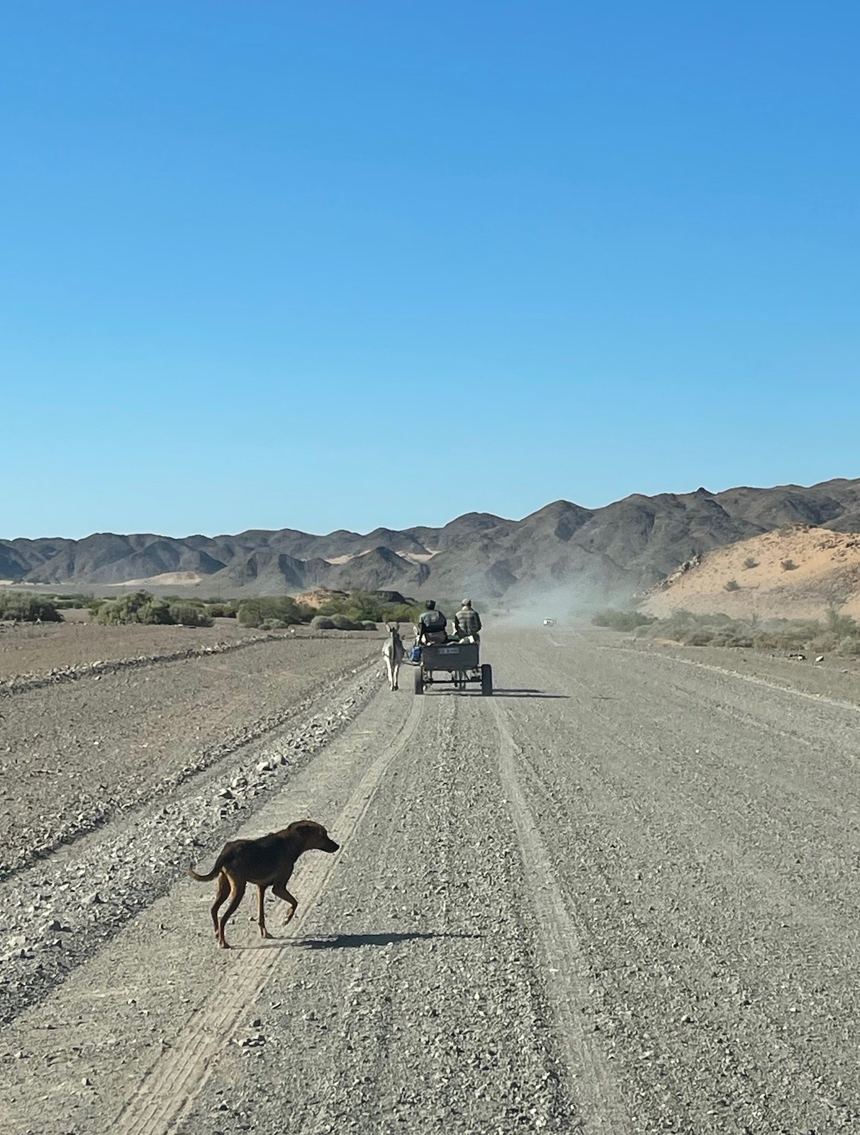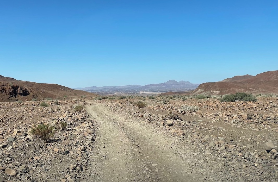 Vous avez sans doute remarqué sur mes photos que les routes sont rectilignes, plutôt sympa pour profiter des paysages spectaculaires du Damaraland… et d’un ennui mortel sur Desolation Road, la bien nommée. La piste C35, qui devient une route goudronnée, s’étire sur 125 km sans aucun virage entre Uis et la côte atlantique. Aux alentours…rien à voir. C’est le moment de discuter dans la voiture pour ne pas risquer de s’endormir.