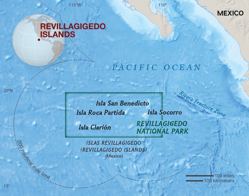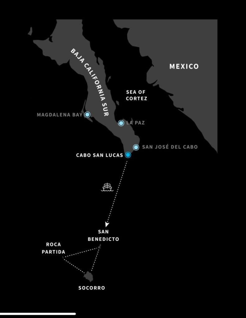L’archipel de Revillagigedo se trouve à 30 heures de navigation de Los Cabos (à environ 400 km) et comprend les 4 îles quasi désertes de Socorro, San Benedicto, Roca Partida et Clarion (plus éloignée que ne nous visiterons pas).