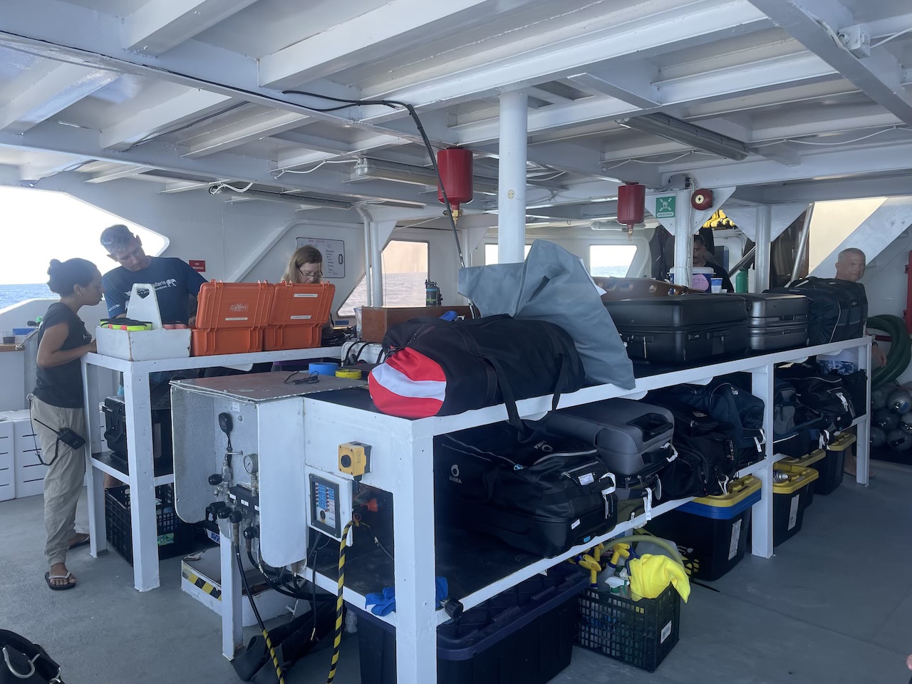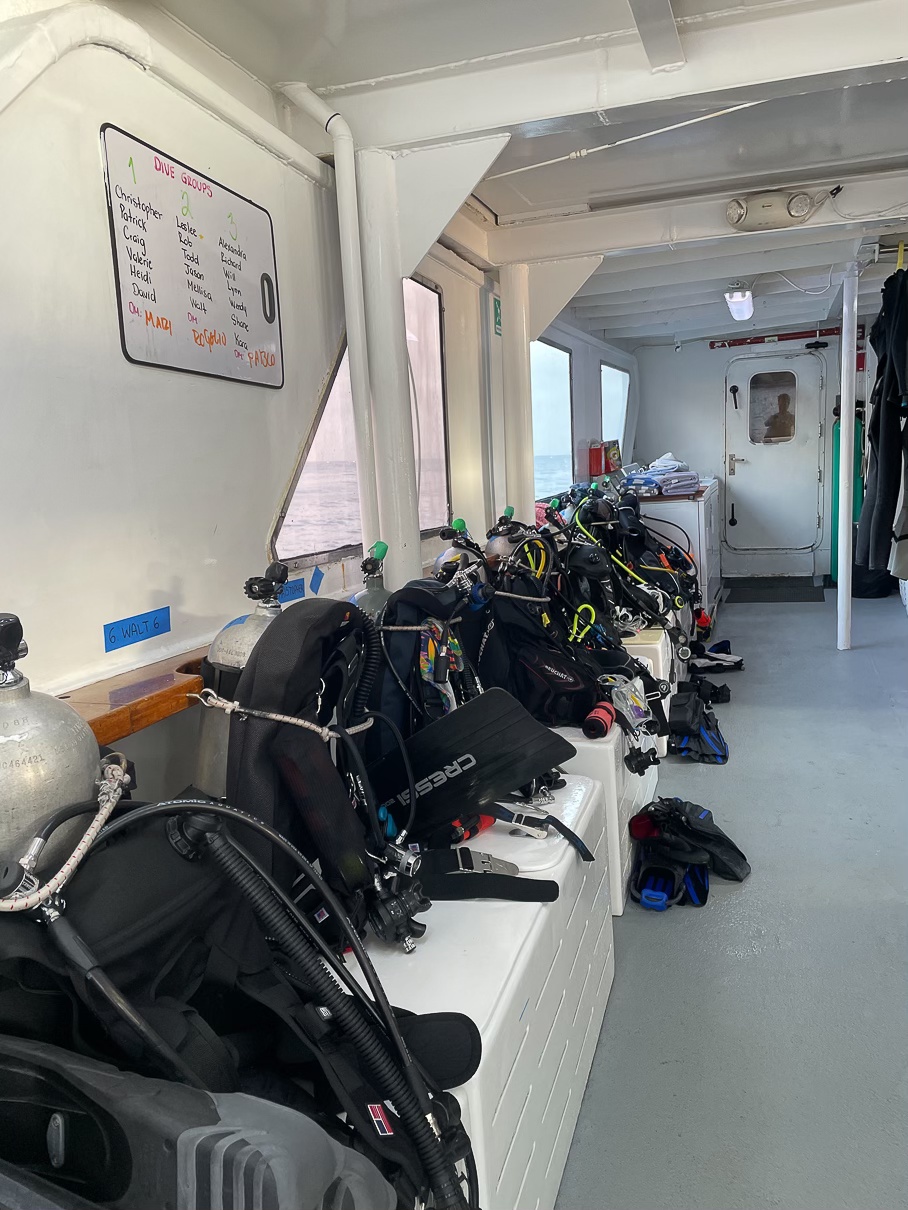 Le pont est parfaitement adapté aux besoins des plongeurs : rangements pour le matériel, tables dédiées aux caméras et appareils photos, plate-forme de mise à l’eau, douche chaude et toilettes.