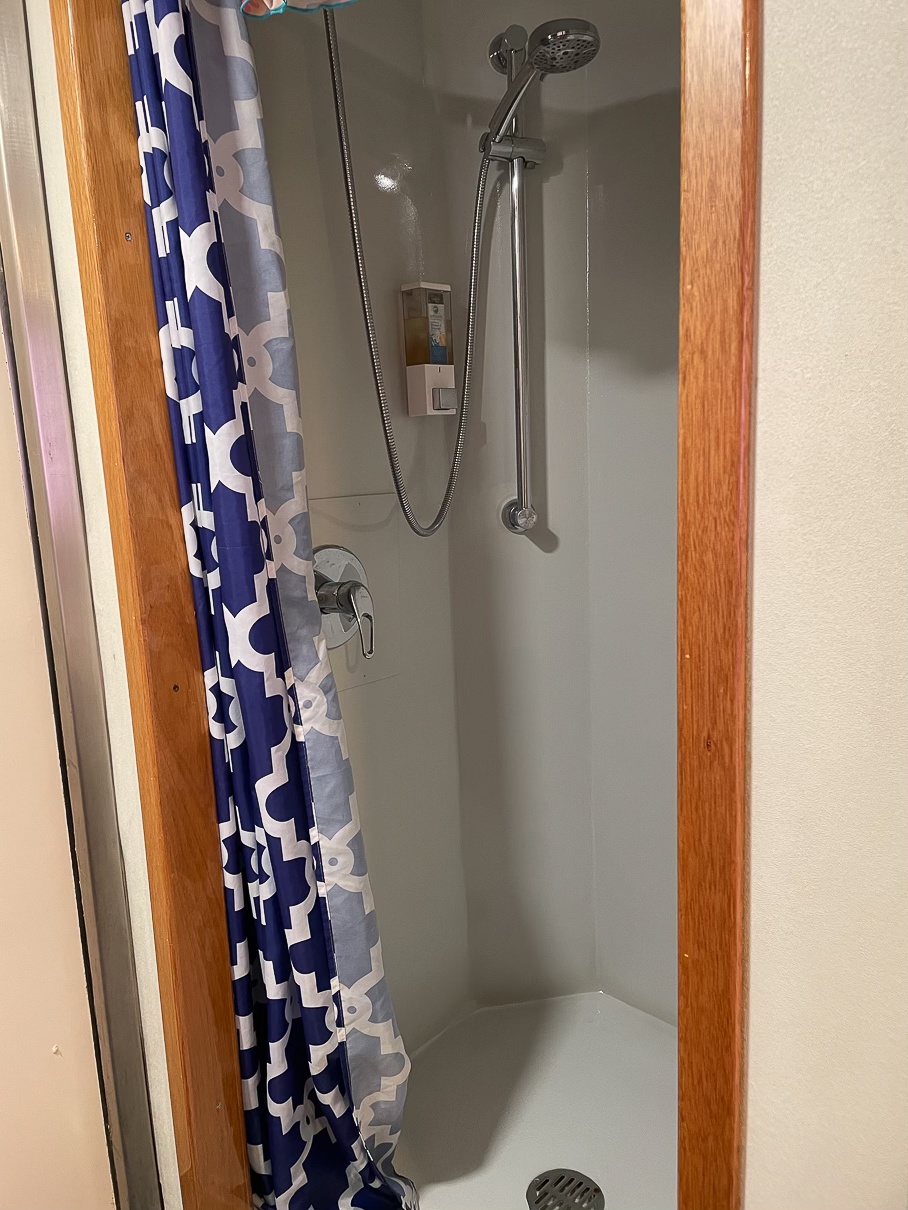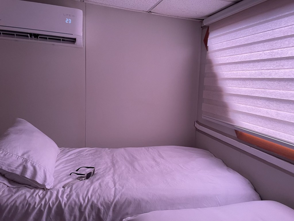 Ce motor-yacht de 28 mètres de longueur dispose de 8 cabines. La nôtre, nommée Rosario comme sur le Gallant Lady, est sur le pont principal, avec une grande fenêtre. C’est la cabine accessible aux personnes à mobilité réduite (c’est très relatif sur un bateau), elle est parfaite pour moi qui suis un peu claustrophobe sous la ligne de flottaison.