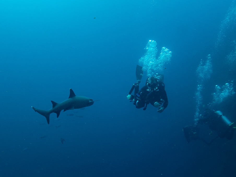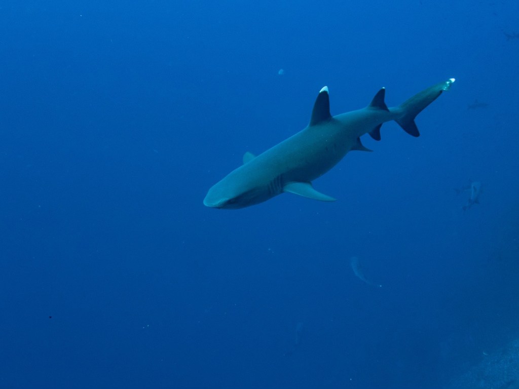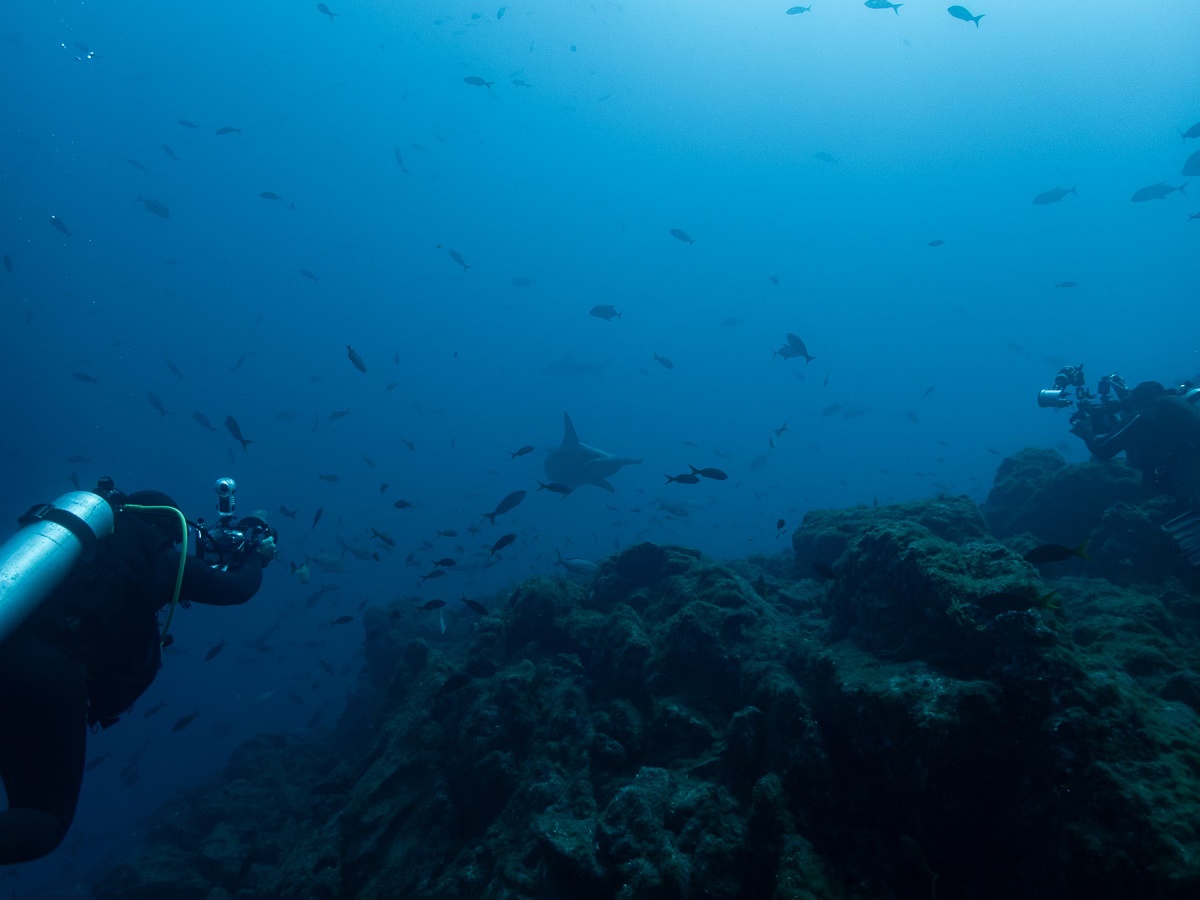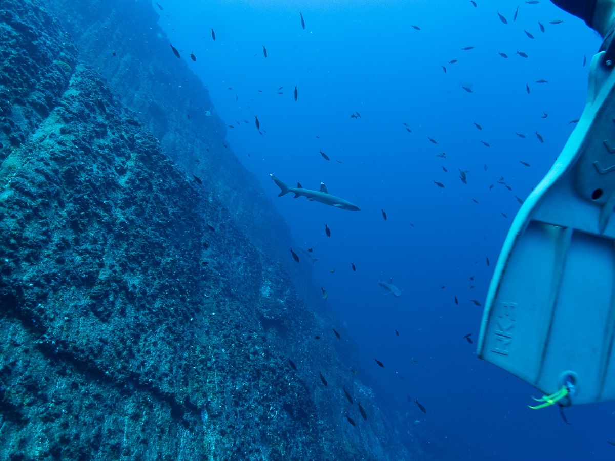 Le site de plongée est tout petit. Il est possible de faire le tour deux fois au cours d’une même plongée, à condition de tomber sur un jour sans courant. Les parois presque verticales du pinacle sont couvertes de fissures et de crevasses, où vivent des murènes et d’énormes langoustes. Nous avons croisé de nombreux requins de récifs à pointe blanche, certains se rassemblent pour dormir sur les plateaux horizontaux vers 15 mètres… Ainsi que quelques requins du large à pointe blanche et beaucoup de carangues. Une manta de passage à la station de nettoyage nous fait le plaisir de venir nous observer.